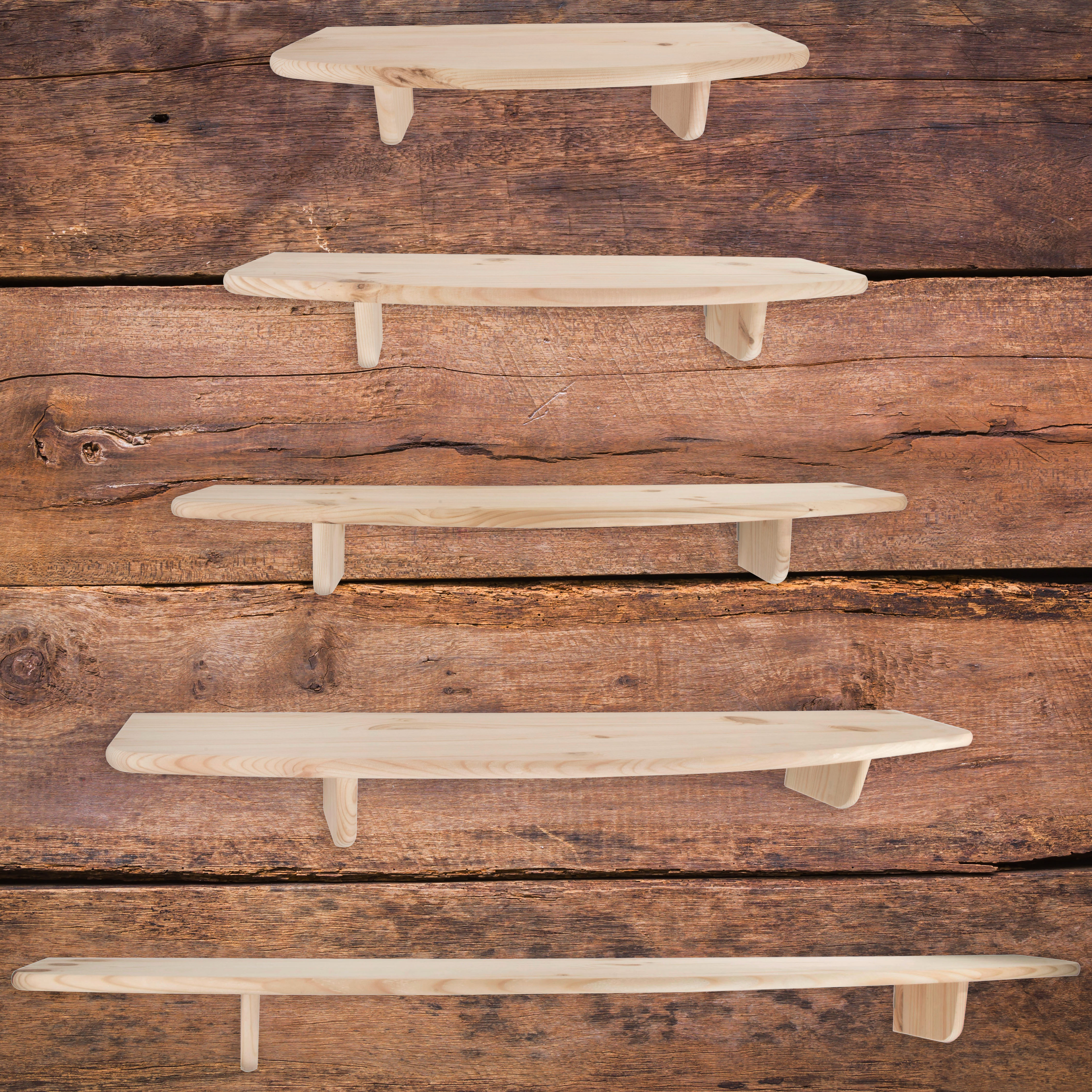 Wooden floating shelves. 5 sizes to choose from. Made of unpainted pinewood. Ideal for DIY decorating with various methods.