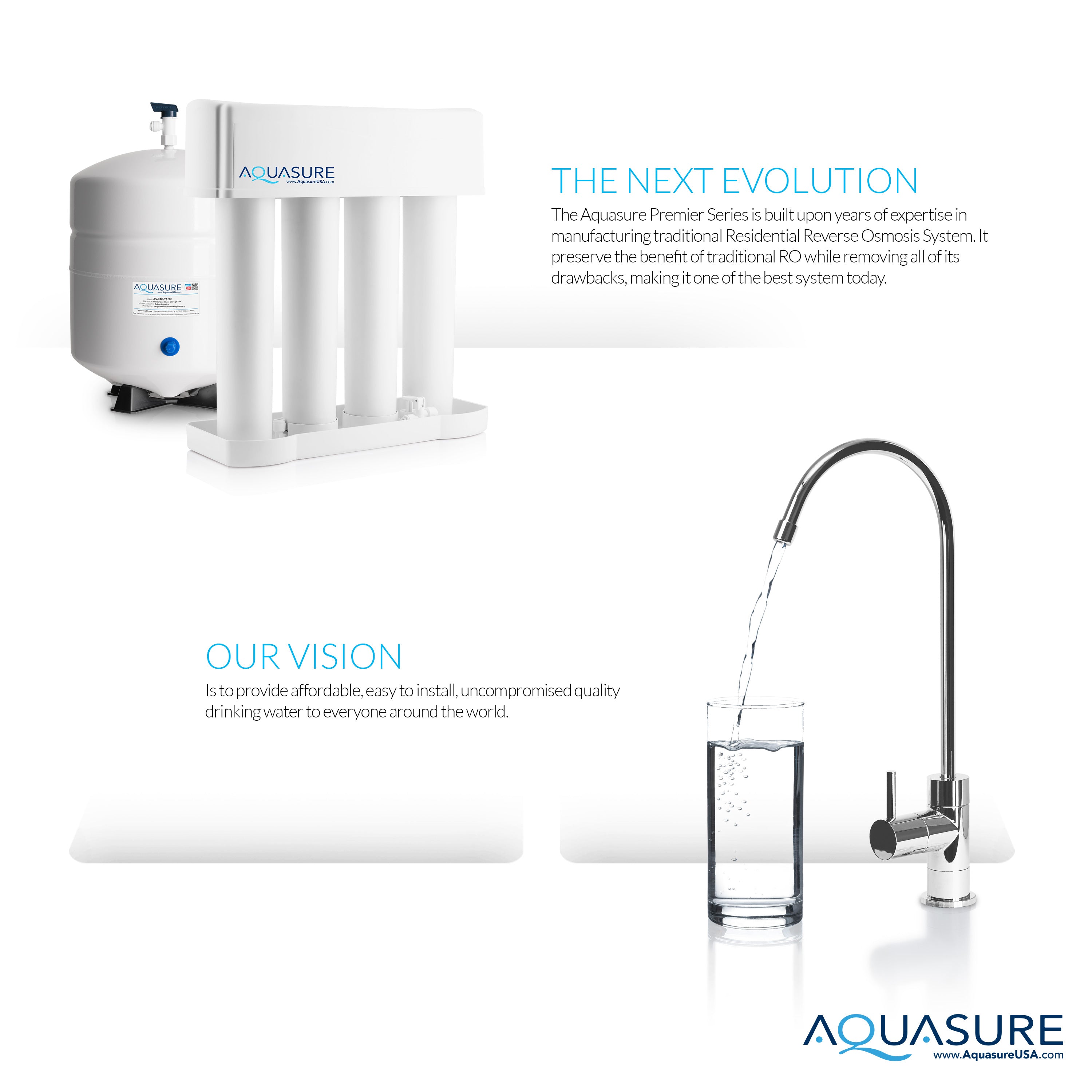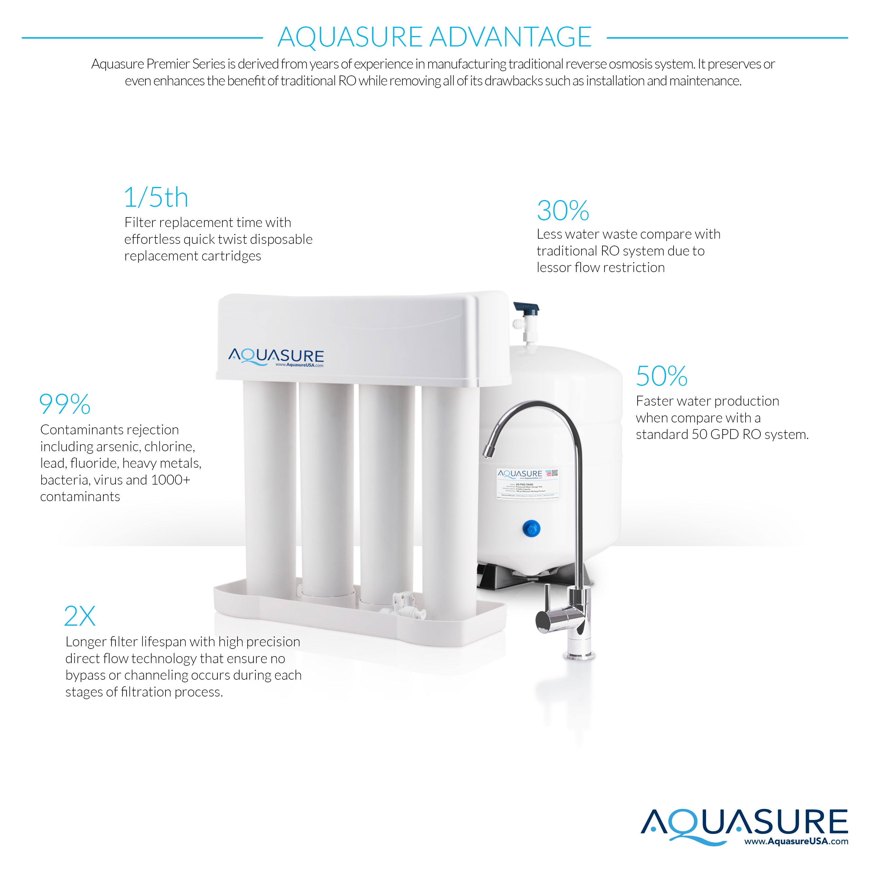 Aquasure Premier Advanced Series of Reverse Osmosis drinking water system is built to provide the best quality drinking water for the entire family. Its 4 stages water filtration process eliminate up to 99.9% of the containment in the water while giving you unlimited refreshing clean, healthy, crisp tasting water.