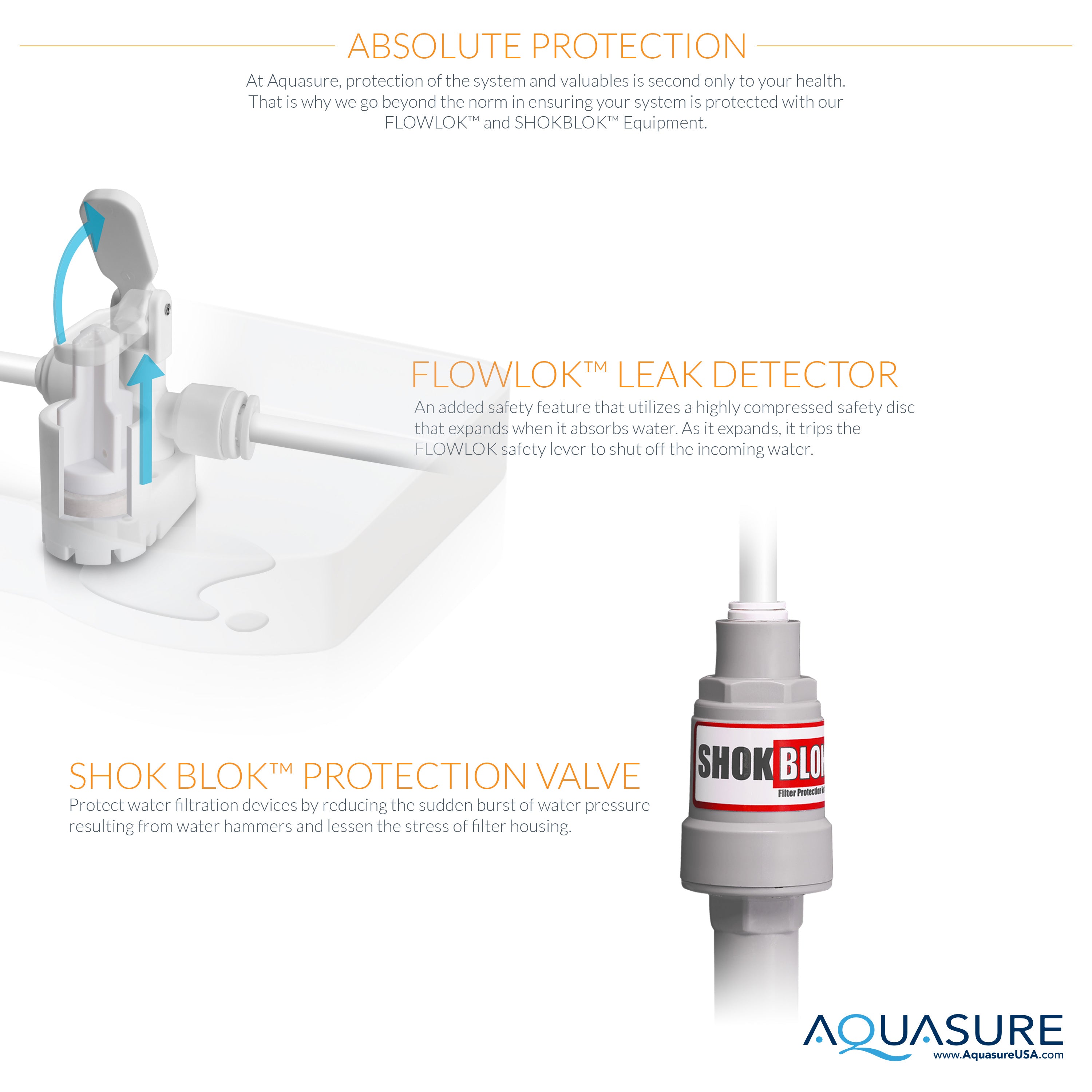 Every Aquasure reverse osmosis system comes equipped with our FLOWLOK™ & SHOKBLOK™ technology. The system also comes with 1-year limited warranty and lifetime tech support. Feel confident that your system will always perform as the way it should.