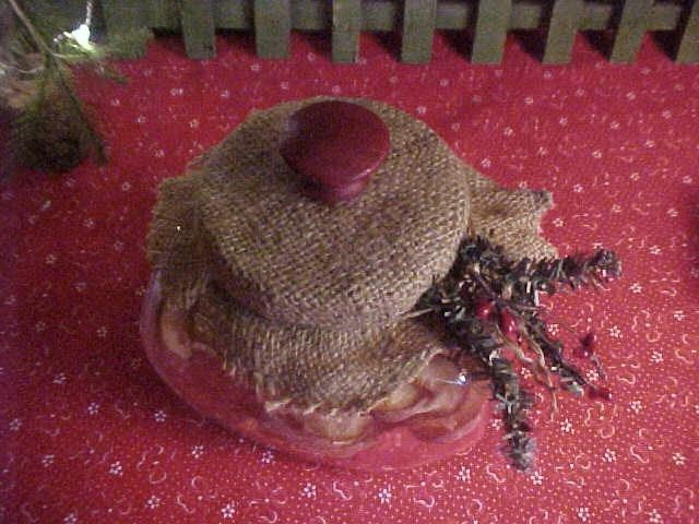 Bright Red Wooden knob on top of the burlap covered metal lid.