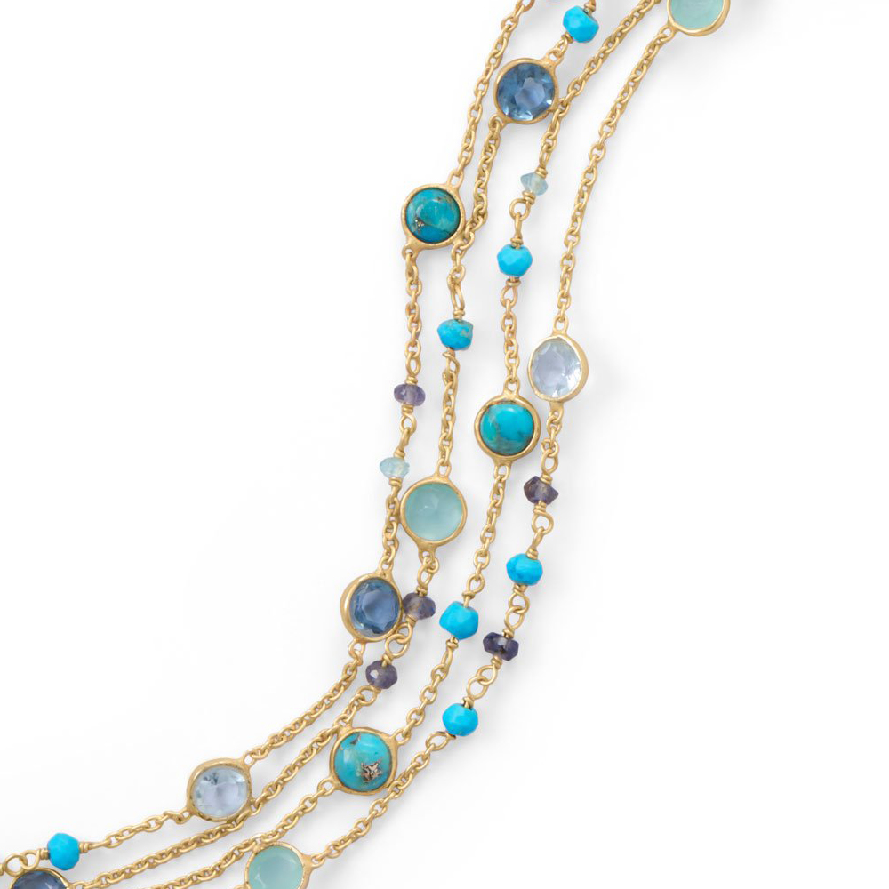 You won't be singin' the blues about this darling bracelet! This 7 inch long with a 1 inch extension, 14 karat gold plated sterling silver bracelet features an assortment of blue toned gemstones. Bezel set turquoise, chalcedony and glass all 5mm. Pops of colored beads ranging in size from 1.5mm x 2.5mm to 2.5mm x 3.5mm in synthetic turquoise, apatite and iolite run along the bracelet and it fastens with a lobster clasp closure.