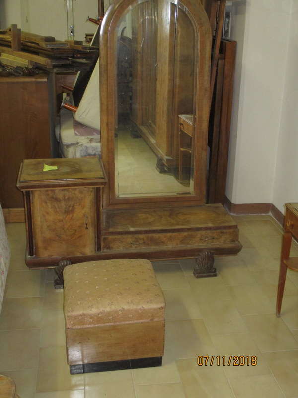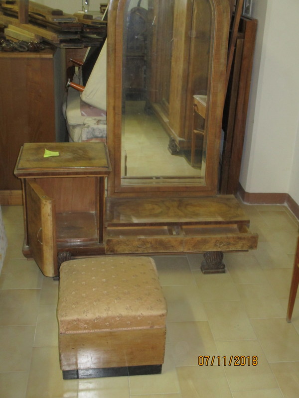 TOILETTA COMPLETA CON SPECCHIO SAGOMATO + POUF CAMERA ANNI '40 | |