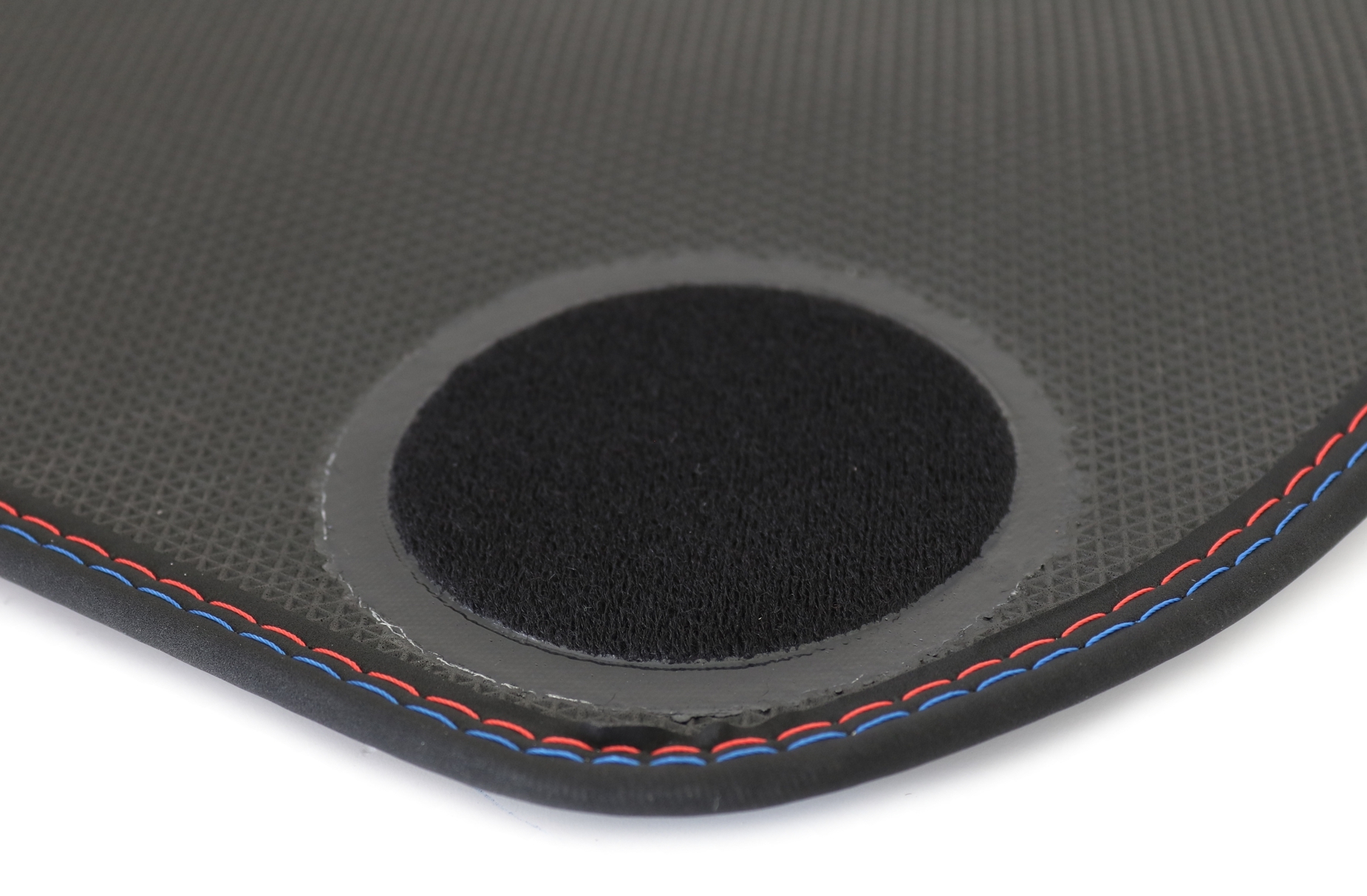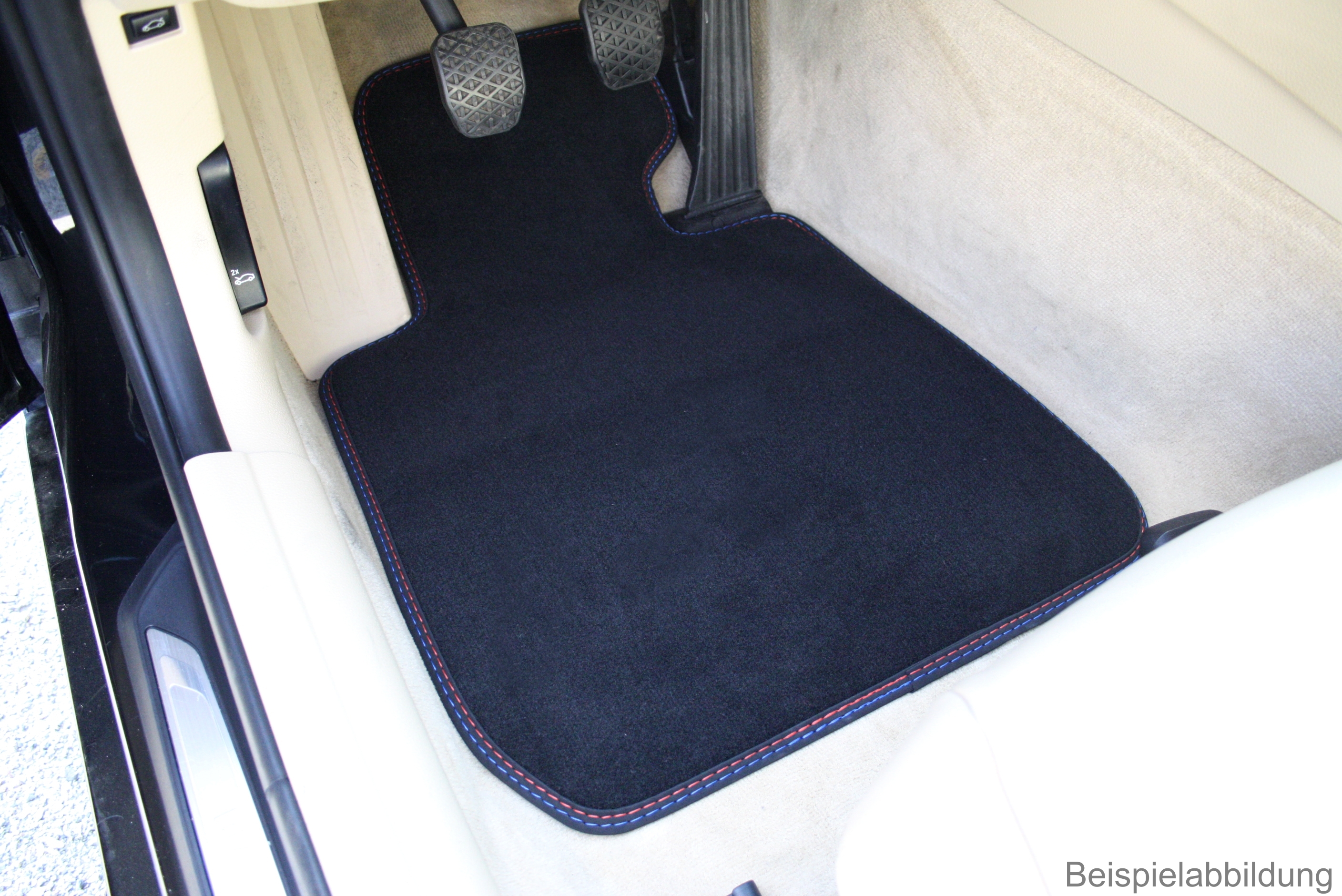 Ein zusätzliches light bei diesen Premium Fußmatten ist der farblich eingefasste Rand, bestickt mit 2 Fäden, in den Farben Rot und Blau. Mit diesem kleinen Detail statten Sie den Fahrzeug-Innenraum im Look der teuren Sportwagenserie aus.