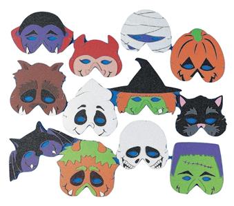 Attend a Halloween party in disguise by wearing one of these Monster Masks (size: 7 1/2" , multi-color). Secure with an included elastic band. Assortment includes vampire, pumpkin, black cat, werewolf, witch, mummy, ghost, green monster, devil, bat, and skeleton foam masks. Assortment may vary. 12 masks per order.