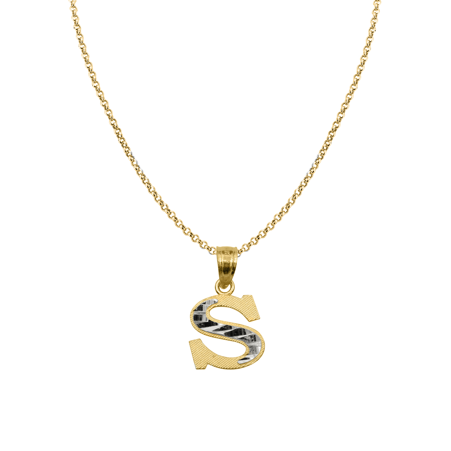 Genuine 14k Two-tone Gold 0.59" Diamond-cut Initial Letter S Necklace 16" to 22"