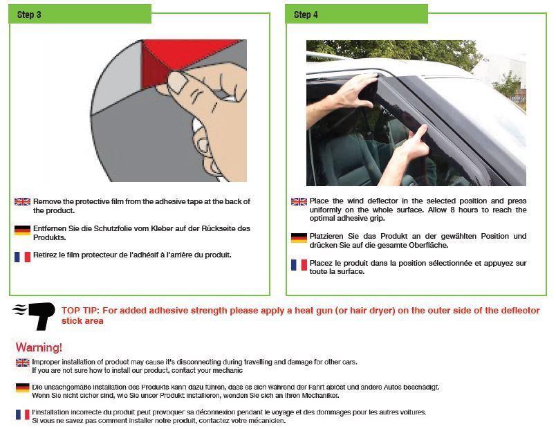Mounting is done by using heavy duty adhesive 3M tape (supplied). The push in / clip in type can give trouble as manufacturer's have the designed the window frame for the window only. This is why adhesive fit deflectors are preferred. Once fitted correctly, as per our instructions, these deflectors are guaranteed to last the lifetime of the vehicle.