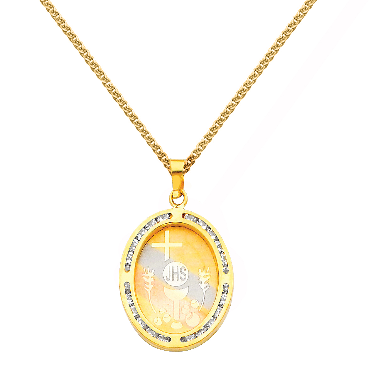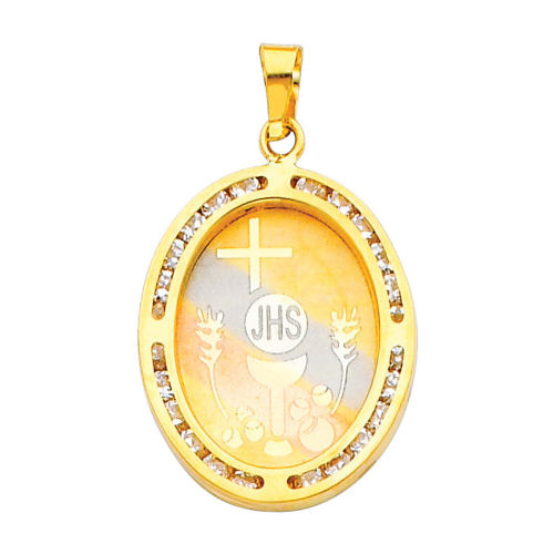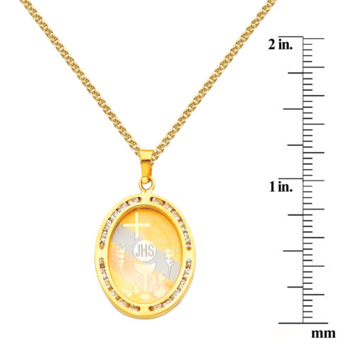 This exquisite 14k Tri-Tone Gold Cubic Zirconia First Communion Religious Pendant Necklace is a thoughtful gift for a first holy communion. Crafted from 14k yellow gold with white and rose gold accents, the pendant features an intricate etching of the host and chalice, surrounded by traditional communion symbols of wheat and bread. Designed with 24 round-cut cubic zirconia set in a channel, the pendant measures approximately 0.98 inches in length. The necklace is complemented by a matching 14k yellow gold flat wheat chain, available in lengths of 16, 18, 20, 22, or 24 inches. This elegant piece combines faith and artistry, making it suitable for both men and women. It is secured with a lobster claw clasp, ensuring durability and ease of wear. A perfect expression of faith, this necklace serves as a lasting keepsake for such a significant occasion. It is important to note that while this pendant depicts a young child, this pendant is not suited for children under the age of 14 without parental supervision.