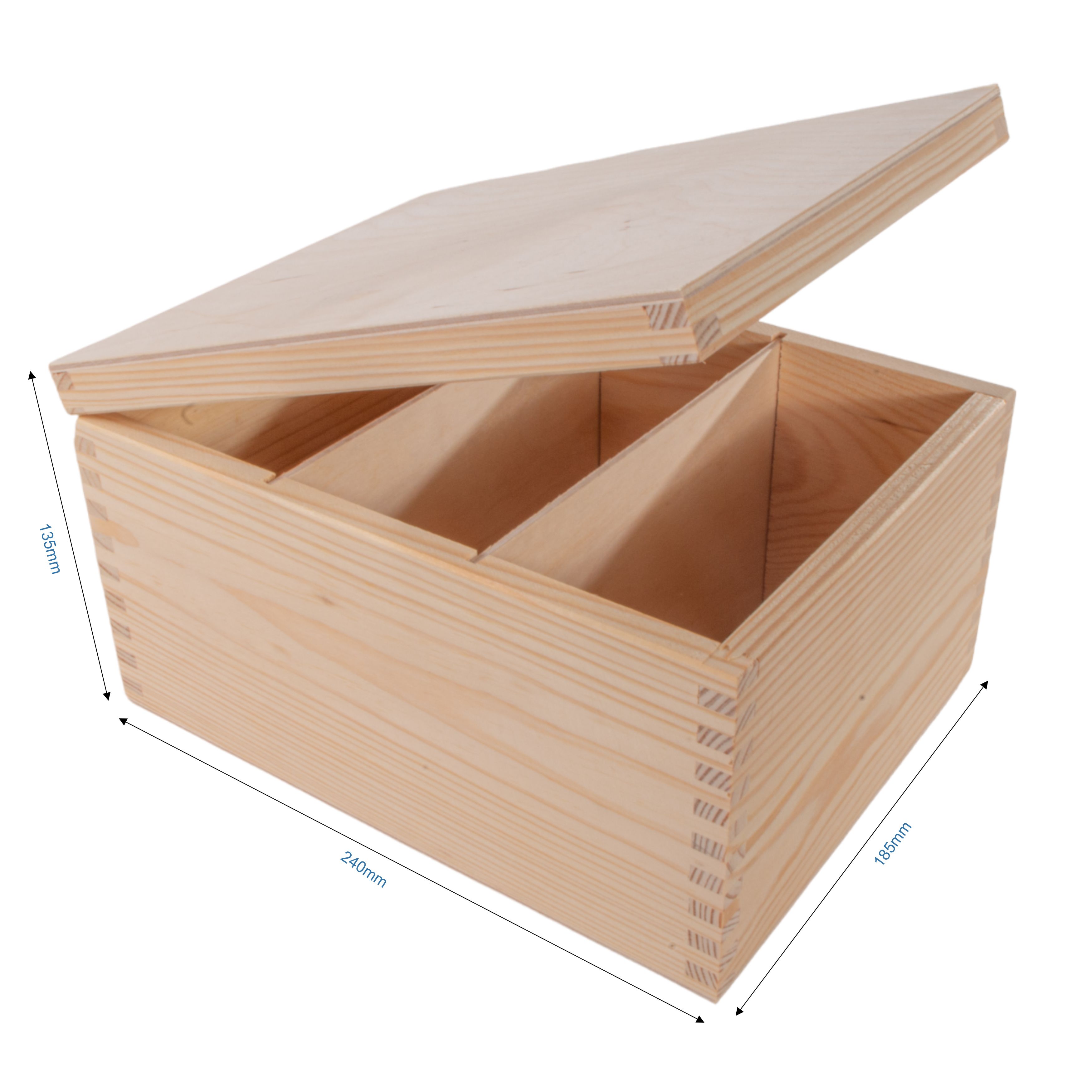 Wooden Compartment Box with Hinged Lid made from pinewood.