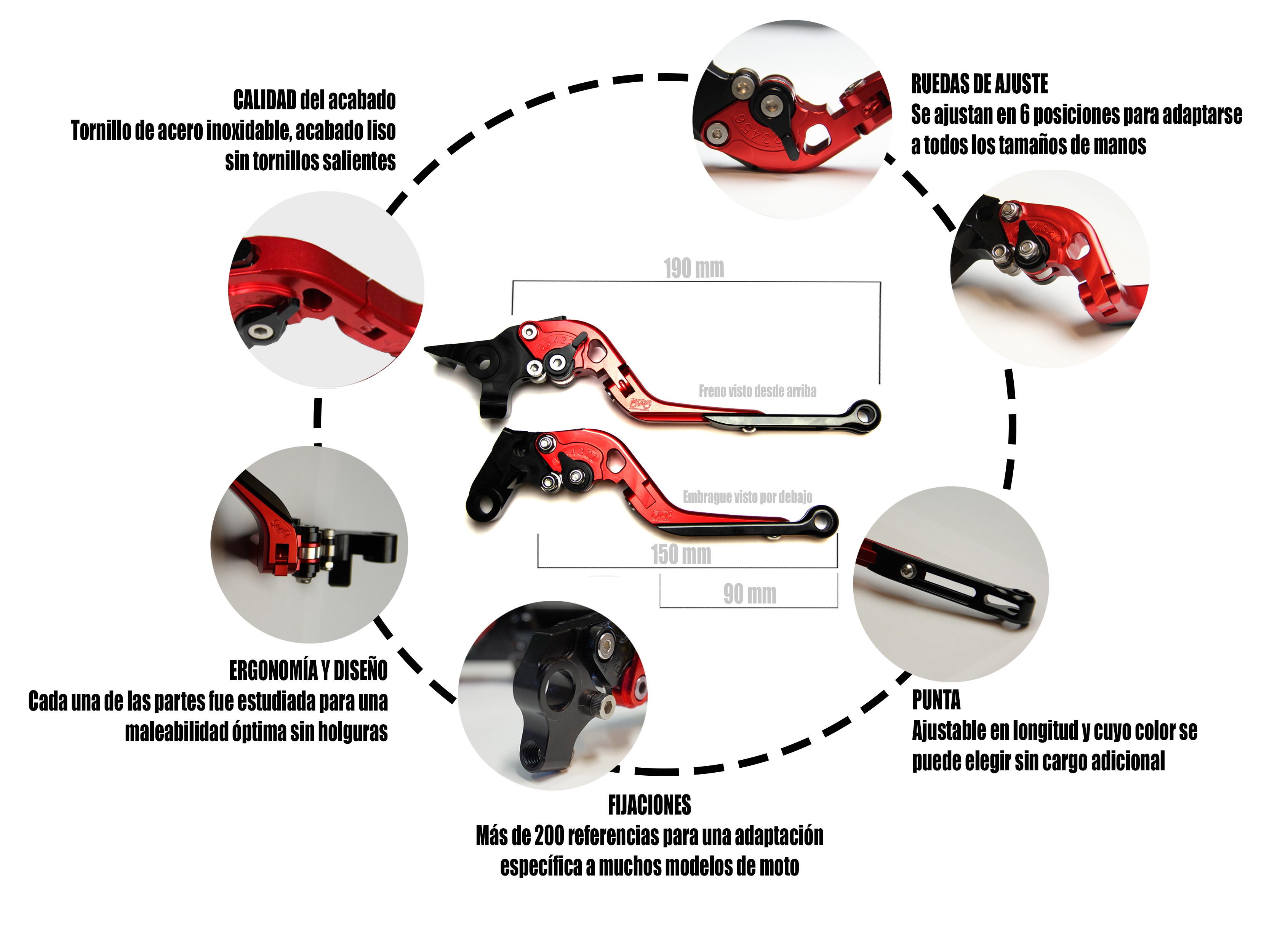 Las palancas son de aluminio CNC 6061, talladas en la masa, de anodización de alta calidad, y garantidas 6 meses. El espacio de separación de la palanca es ajustable en 6 posiciones, adaptándola a todos los tamaños de mano.