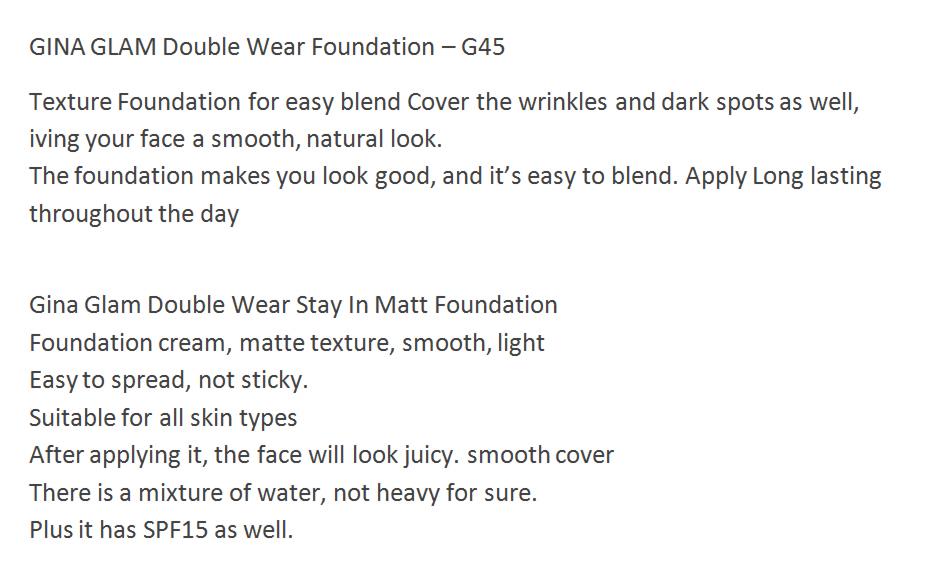 | Gina Glam Double Wear Stay In Matte foundation SPF15 G45 30ml. #01White |