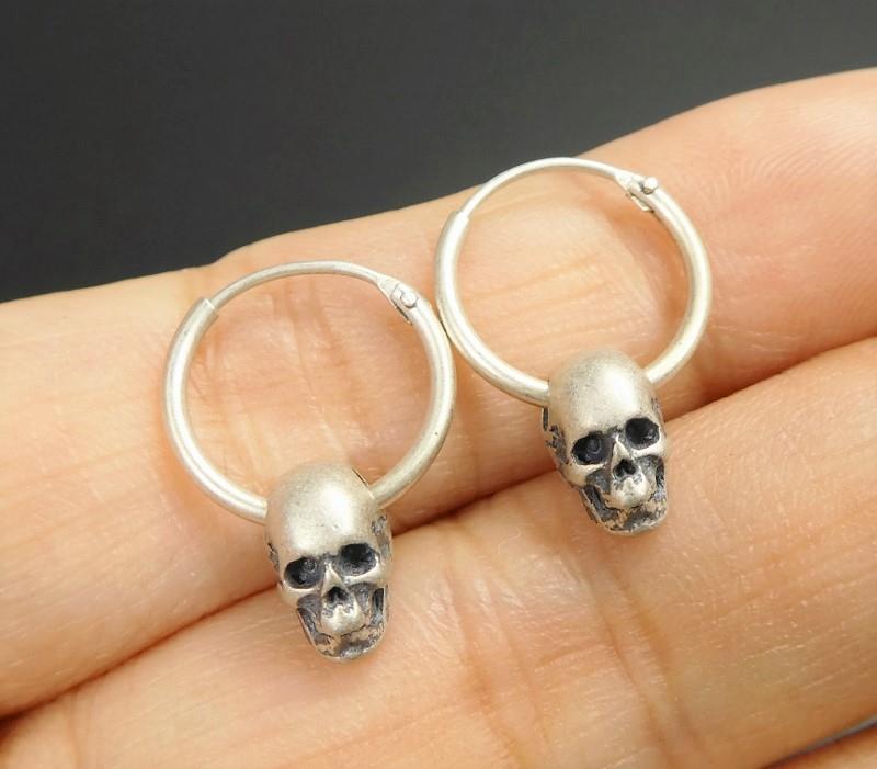 Add character to your look with these small skull on hoop earrings! Tiny sterling silver skull dangles on small hoops. The surface is slightly brushed and oxidized to have nice matte finish. Small and lightweight. Unique gothic accessory perfect for everyday wear or extra fun for your outfit!