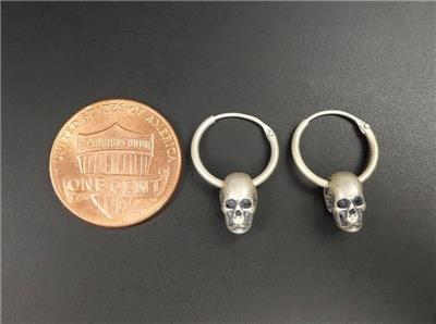 Tiny Small Matte Sterling Silver Skull on Hoop Pierced Earrings Unique Gothic