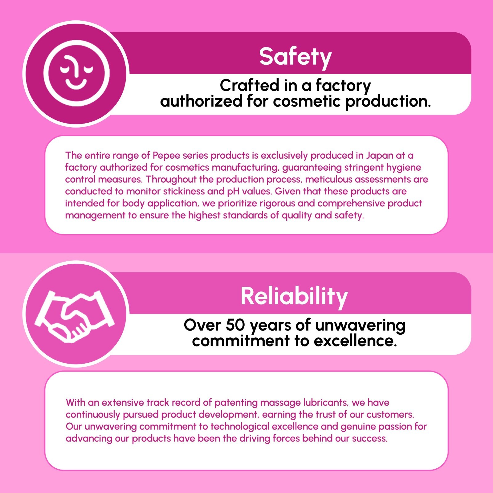 The entire range of Pepee series products is exclusively produced in Japan at a factory authorized for cosmetics manufacturing, guaranteeing stringent hygiene control measures. Throughout the production process, meticulous assessments are conducted to monitor stickiness and pH values. Given that these products are intended for body application, we prioritize rigorous and comprehensive product management to ensure the highest standards of quality and safety.