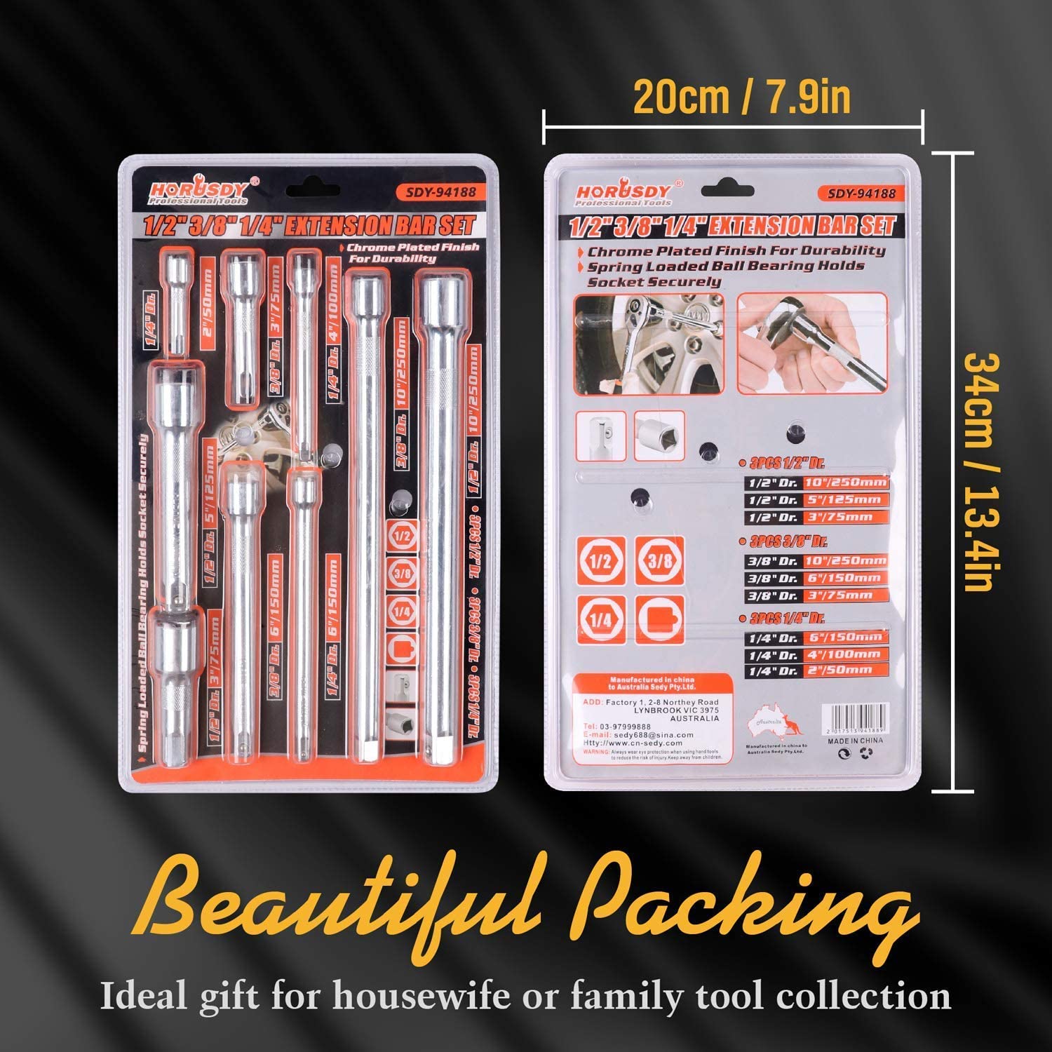 9-Piece Extension Bar Set : three 1/4-inch drive (2, 4, 6 inches); three 3/8-inch (3, 6, 10 inches); three 1/2-inch (3, 5, 10 inches)