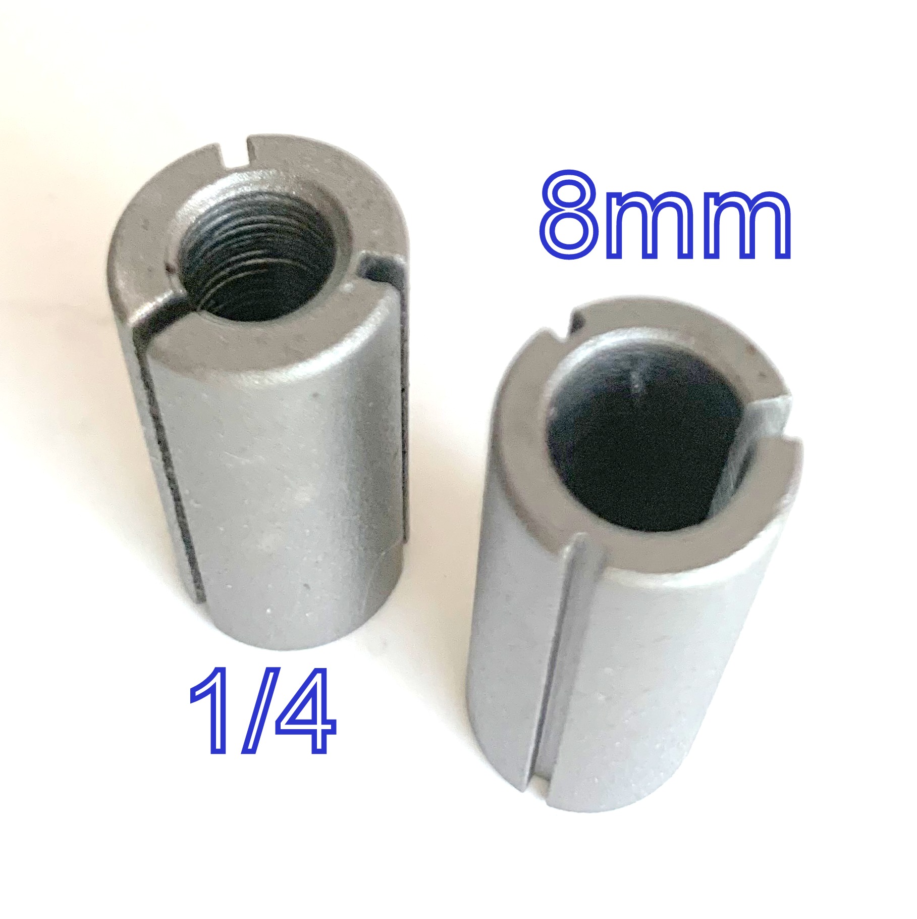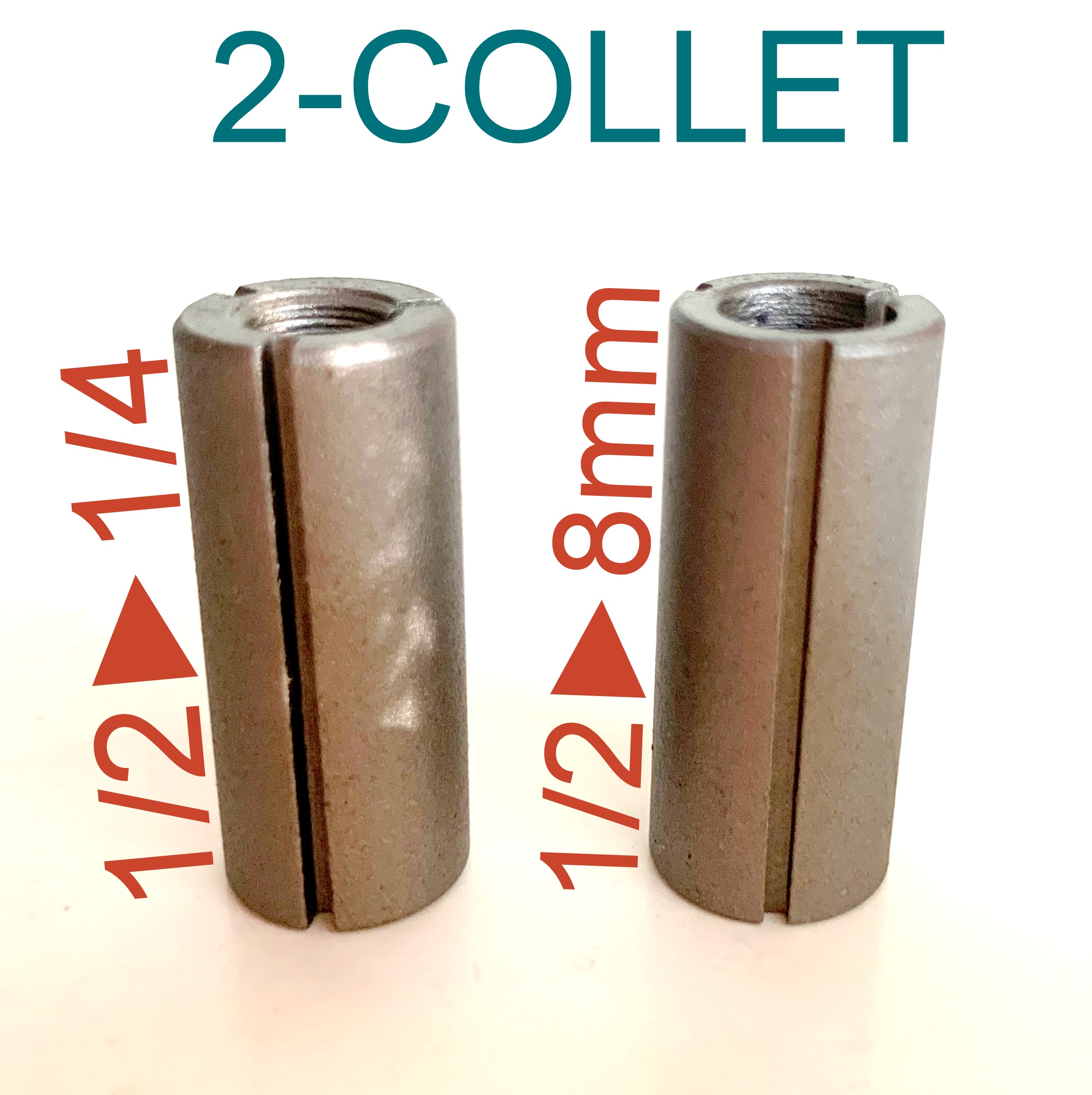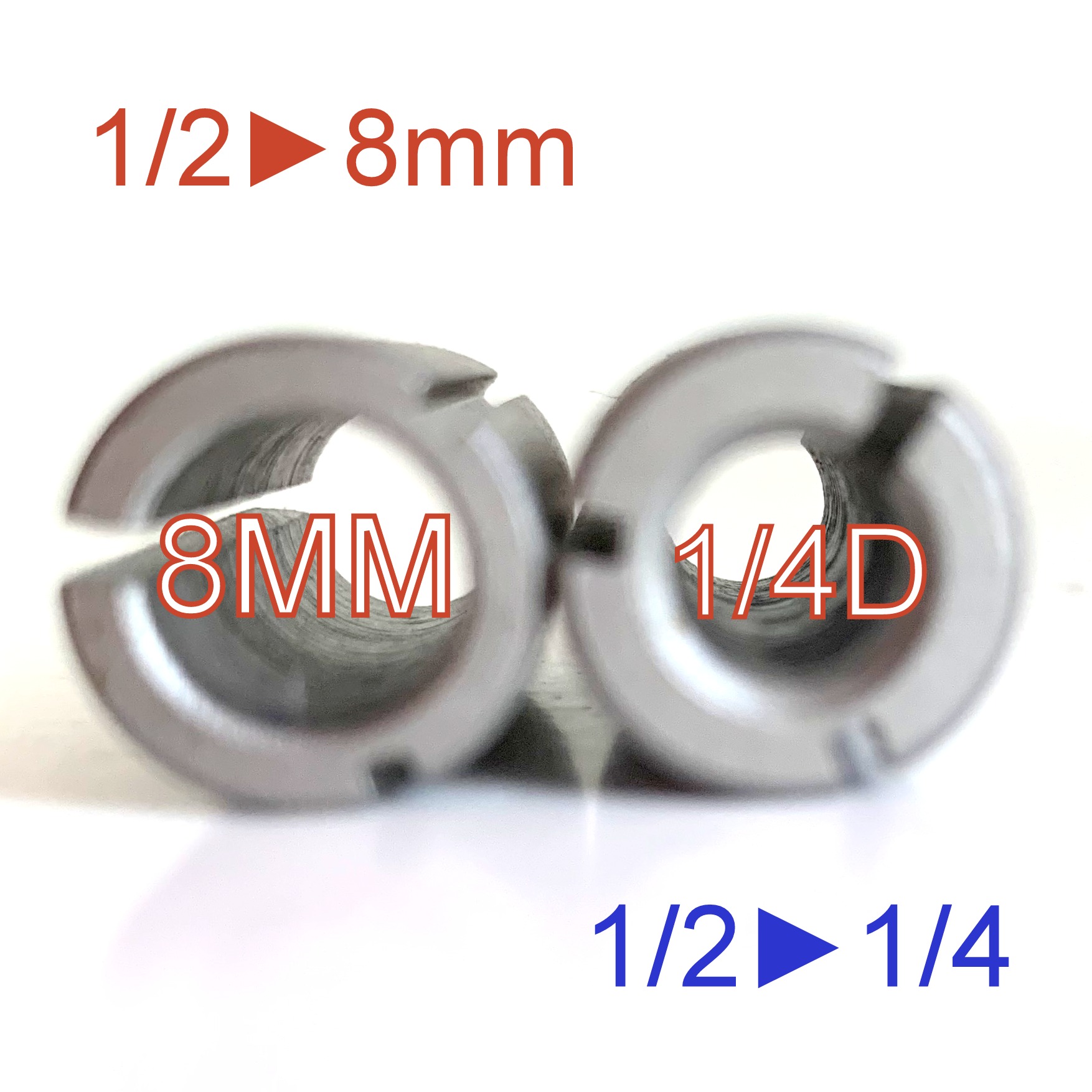 4 pc Collet Reducer Bushings. 2 pc of Reducers are OD 1/2" and ID 8mm and 2 pc Reducers are OD 1/2" and ID 1/4"
