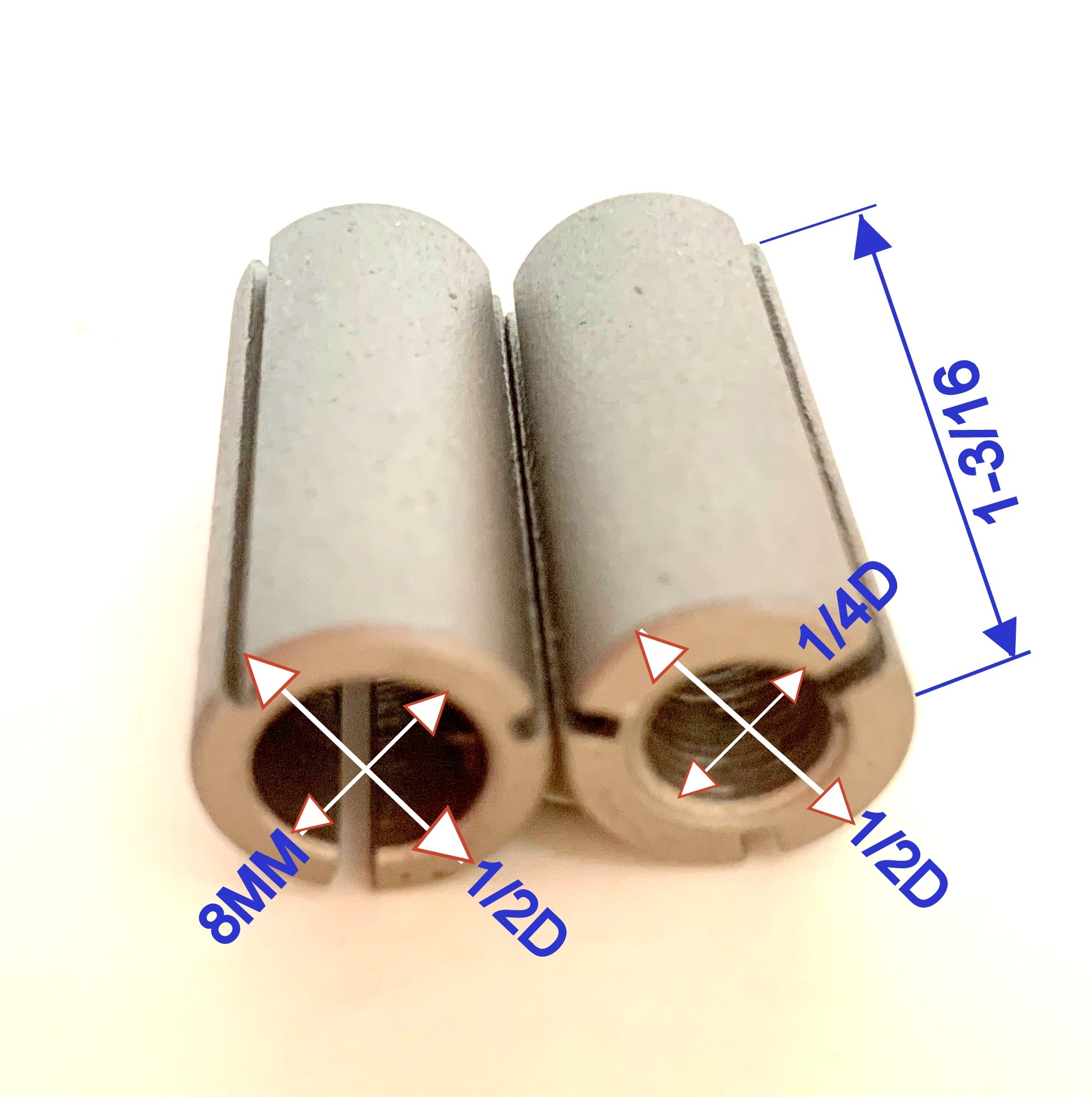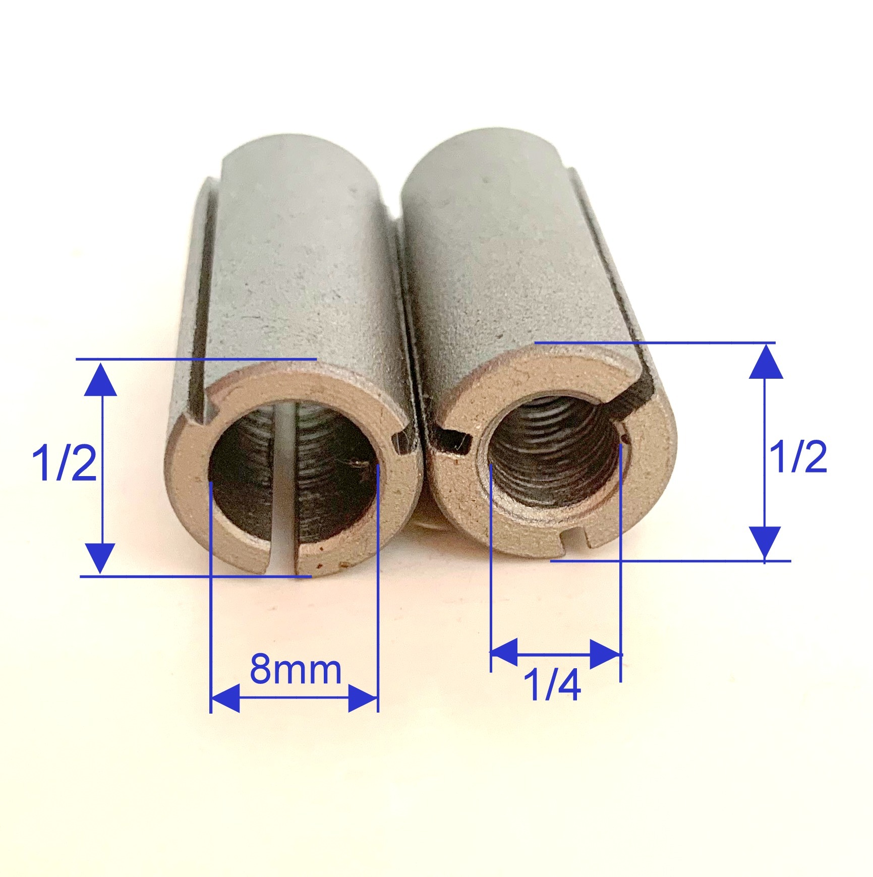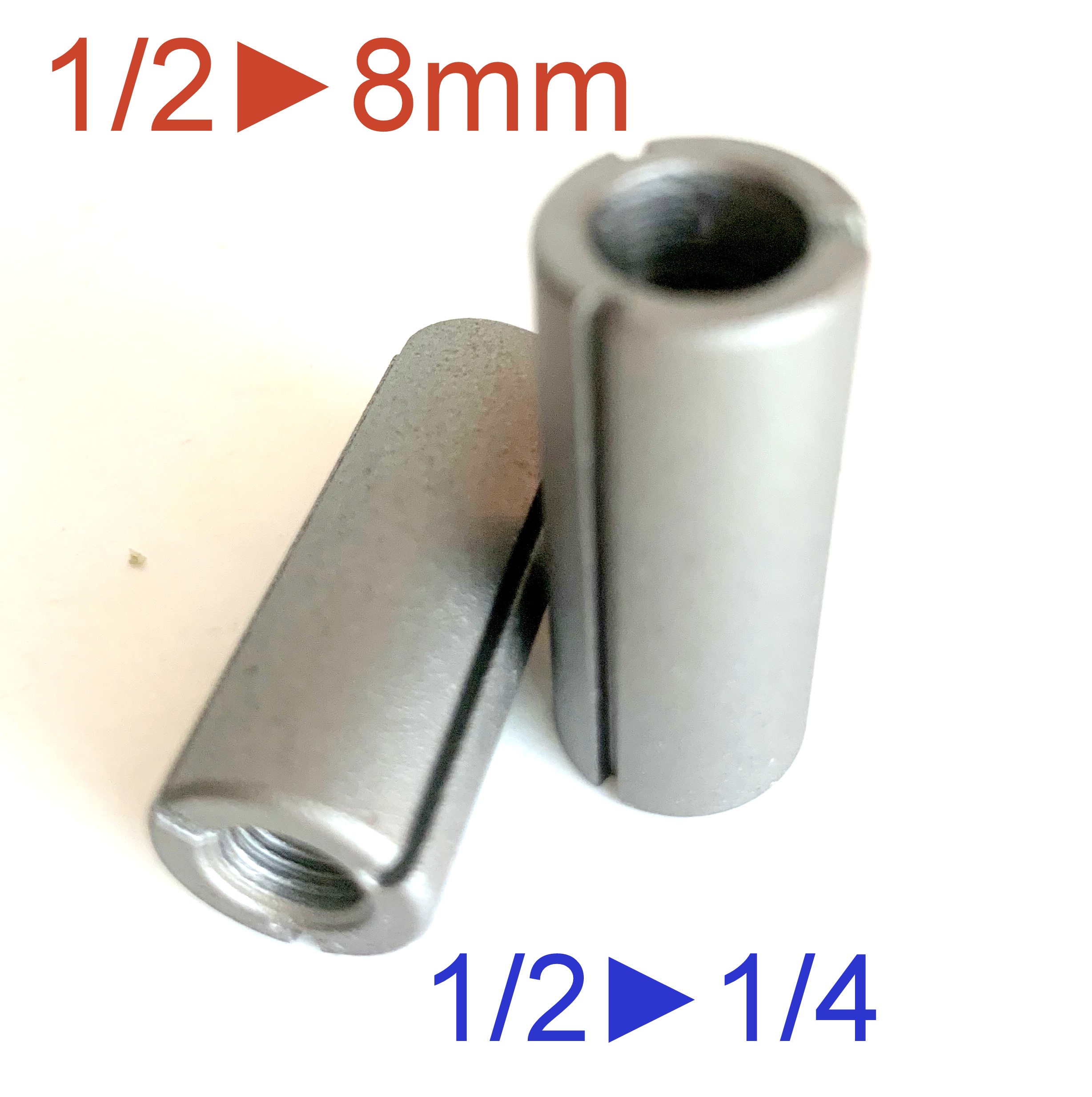 4 pc Collet Reducer Bushings. 2 pc of Reducers are OD 1/2" and ID 8mm and 2 pc Reducers are OD 1/2" and ID 1/4"