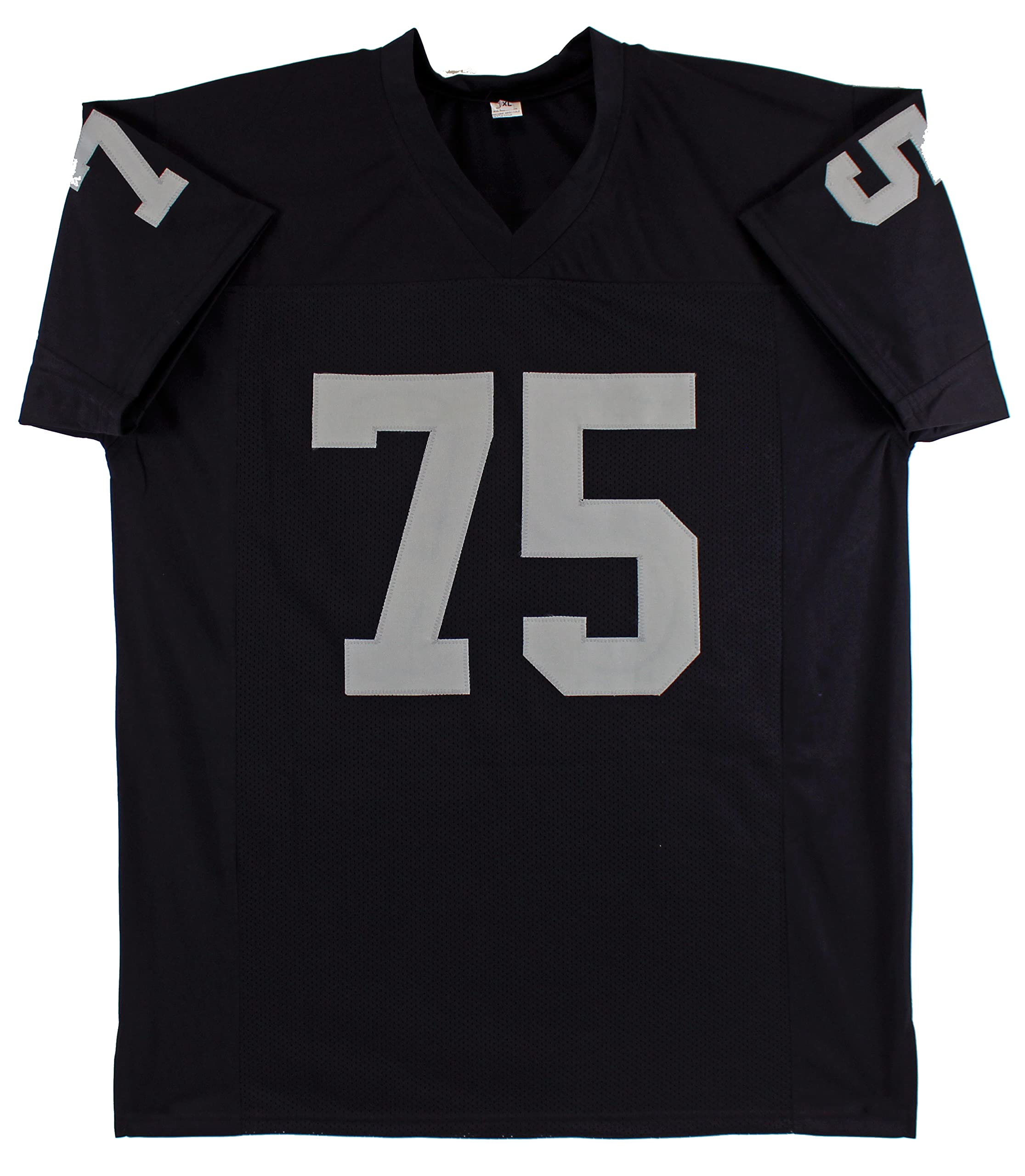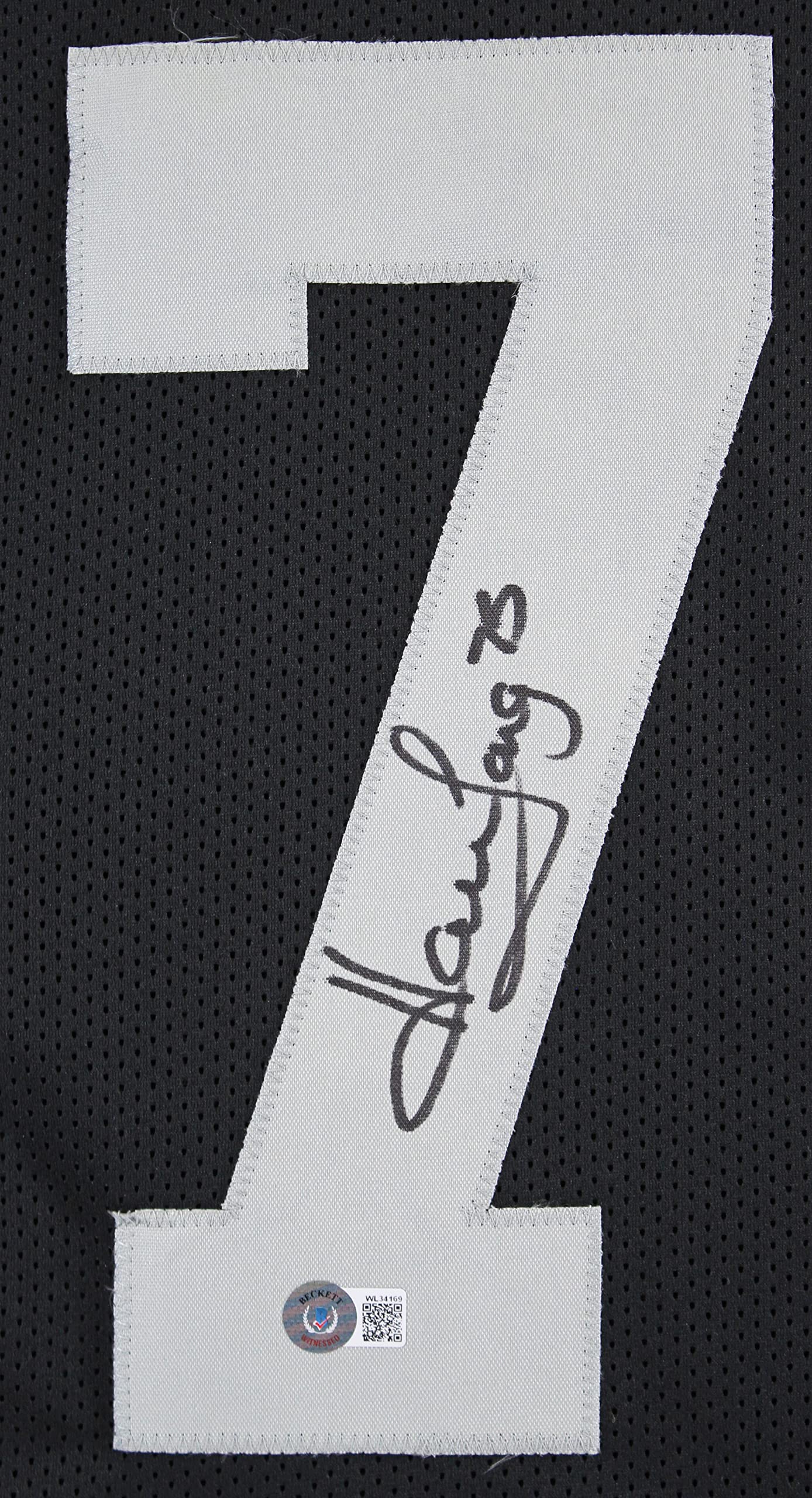 This Autographed Black Pro Style Jersey has been Personally Signed by Howie Long of the Oakland Raiders. This item may come with the new Beckett Authentication hologram that has a scannable QR code rather than the traditional COA. If you would like to have a COA, you are welcome to reach out to Beckett for a printed certification once you receive your item. This is a BAS Witnessed Protection Program item which means a Beckett Authentication Service representative was present when this item was being signed. This is a stock item. We conducted an autograph signing with Howie Long and we have several of these available. The one you will receive will be of equal quality to the one pictured. This item can be verified through BAS Witnessed. This is a X-Large sized, non-branded, custom-stitched Jersey.