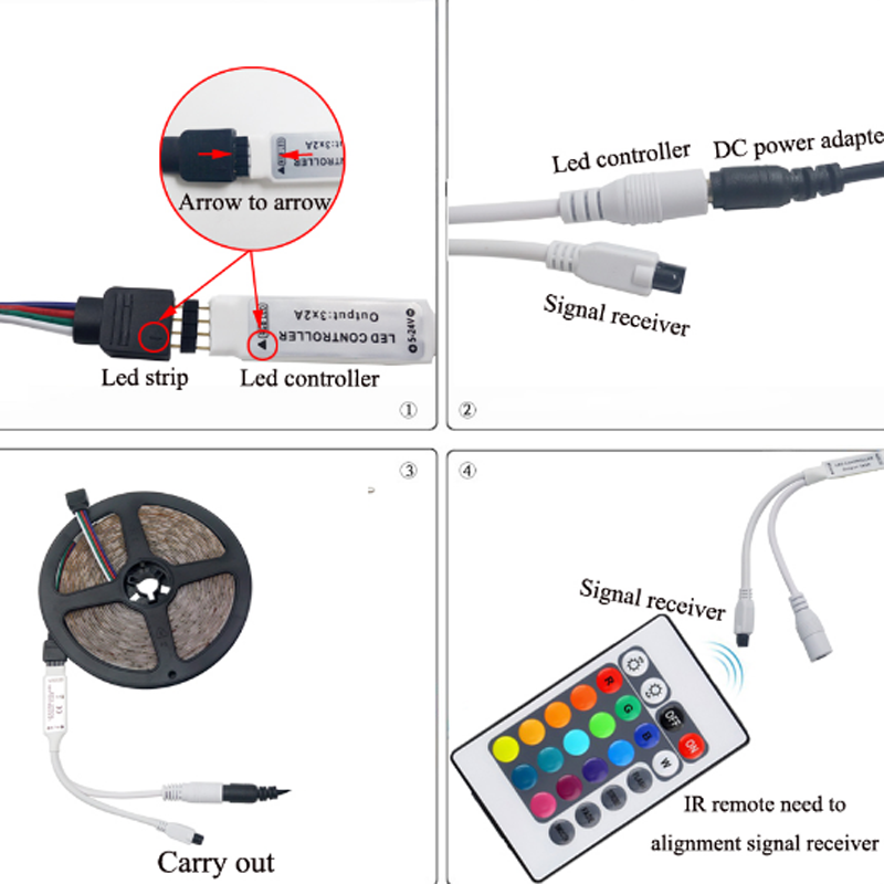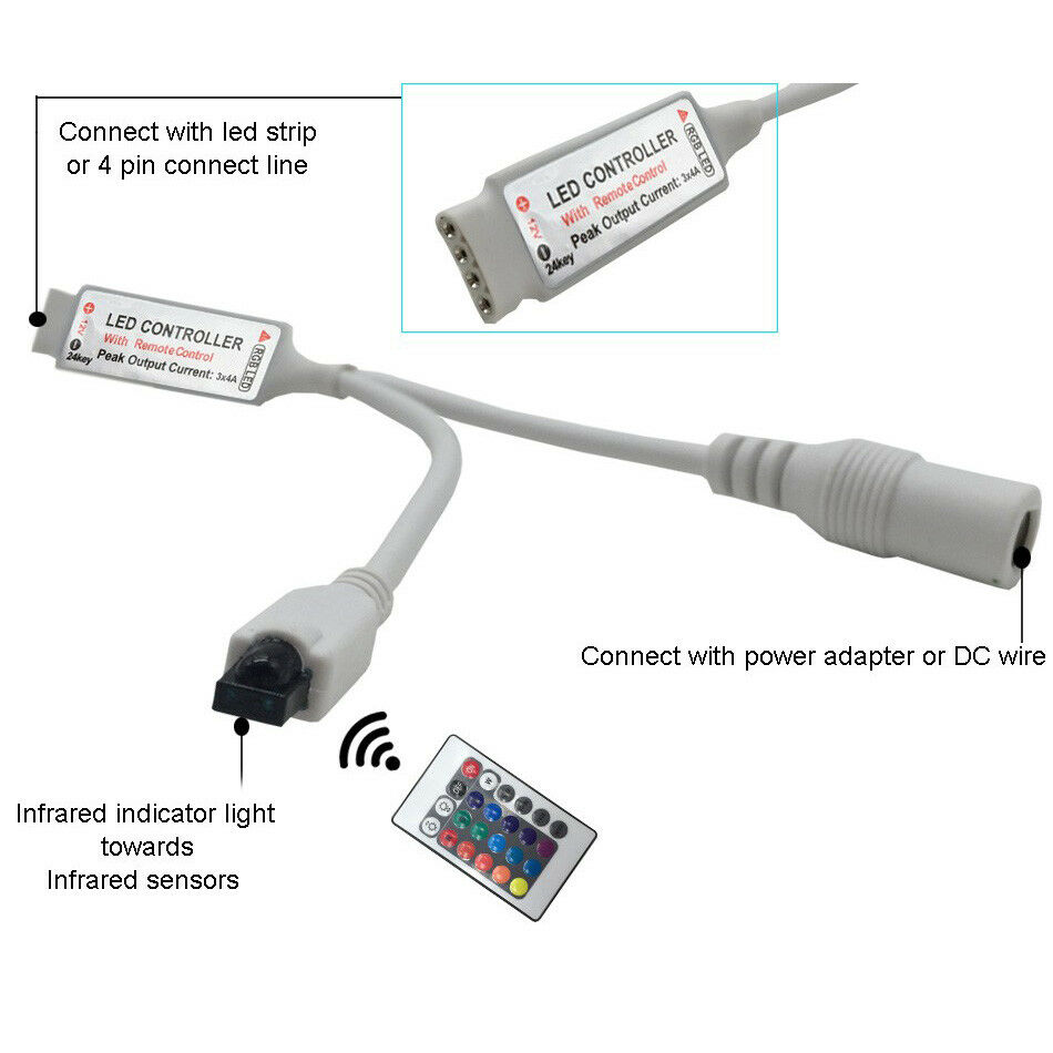 1 x 24 key IR wireless remote control with color changing capability and different flashing and strobing modes. Change from a cool subtle color change or a fast and vibrant strobe effect. Choose from any of the 3 2835 LED light strip comes with 1 red, 1 green and 1 blue in series and then the configuration repeats all the way up to 16' feet. How to install This strip can be mounted in many places; Use it for under cabinet or foot board lighting. Accent walls, hard to reach cubby holes and tables. Select the location where you want to mount the light, take in account how you want to get the 12 volt power to this strip. We suggest starting the wire end of the strip near a power source. Remove the 3M backer and install end to end. Please be careful and plan ahead, this channel will not come off once it has been applied. Remove the 3M backer from the LED strip, then apply. Connect the Strip light wire lead to any 12V source and enjoy your new LED lights for 50,000 plus hours. Note: 4 wThis is very easy for any DIY to do.ire extension so you don't need to wire your receiver box so high. We also sell additional IR and RF remotes that can be switched out for different uses as well as replacement plugs and adaptors. Just ask us and we can send you a link or look in our ebay store. |