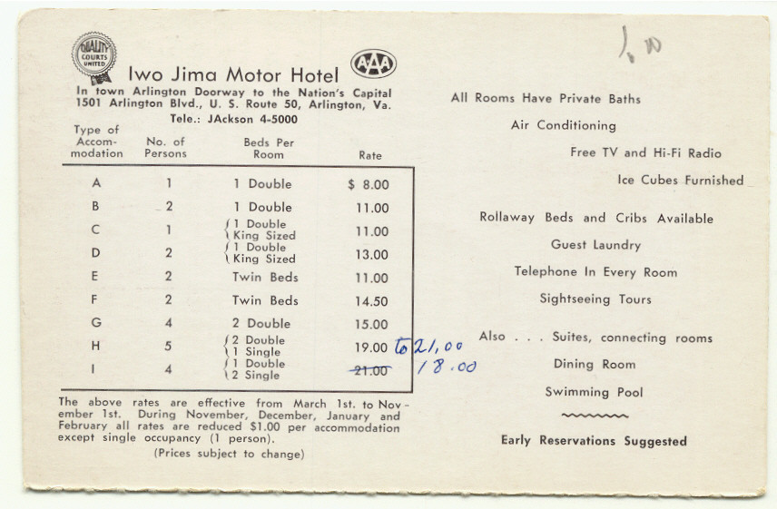 Arlington VA Iwo Jima Motor Hotel with Rates Postcard ~ Virginia
