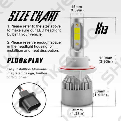 1. Light Type : H13 (High Beam and Low Beam)+ 9145/H10/9140 (fog light) 2. Input Power : 100W/set (50W/bulb) 3. LED Type : COB LED Chips 4. Luminous Flux : approx.8000lm/set (4000lm/bulb) 5. Operating Voltage : DC 9V-32V (fits 12V/24V vehicle) 6. Color Temperature : Ice Blue 8000K 7. IP Rate : IP68 8. Operating Temperature : (-40C) to (+80C) 9. Material : Aviation 6063 Aluminum Profile 10. Life-Span : 50,000Hrs+ 11. Lamp base designed : Turbo designed 12. Installation : Plug and Play 13. Beam Angle : 360° 14. Warranty: 1 Years Warranty Foglight :