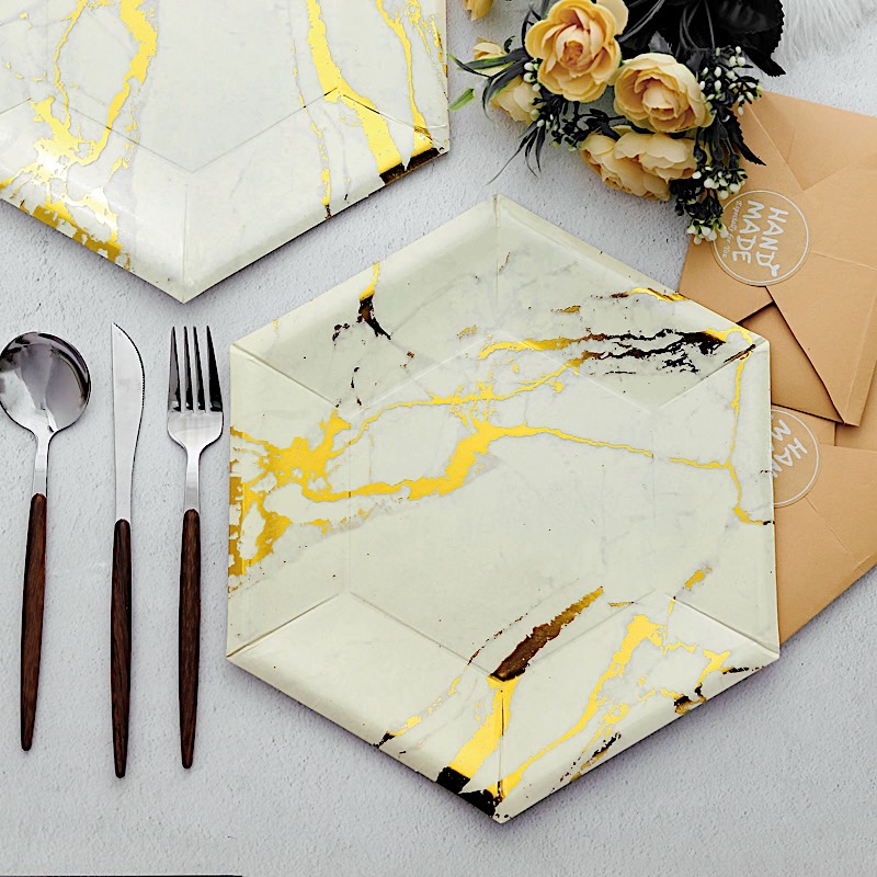 12 in Hexagon Marble Design Disposable Paper Dinner Plates