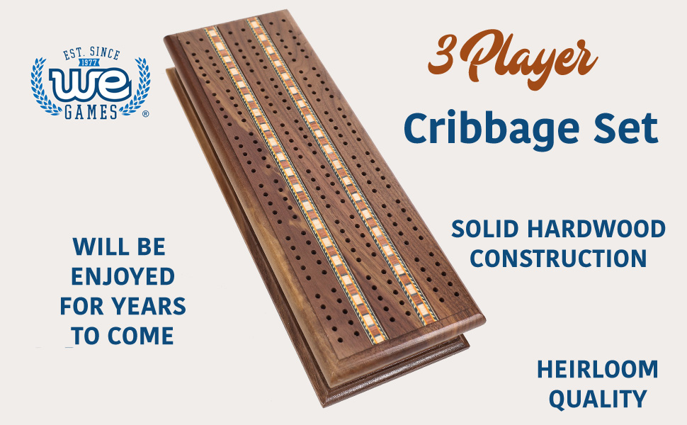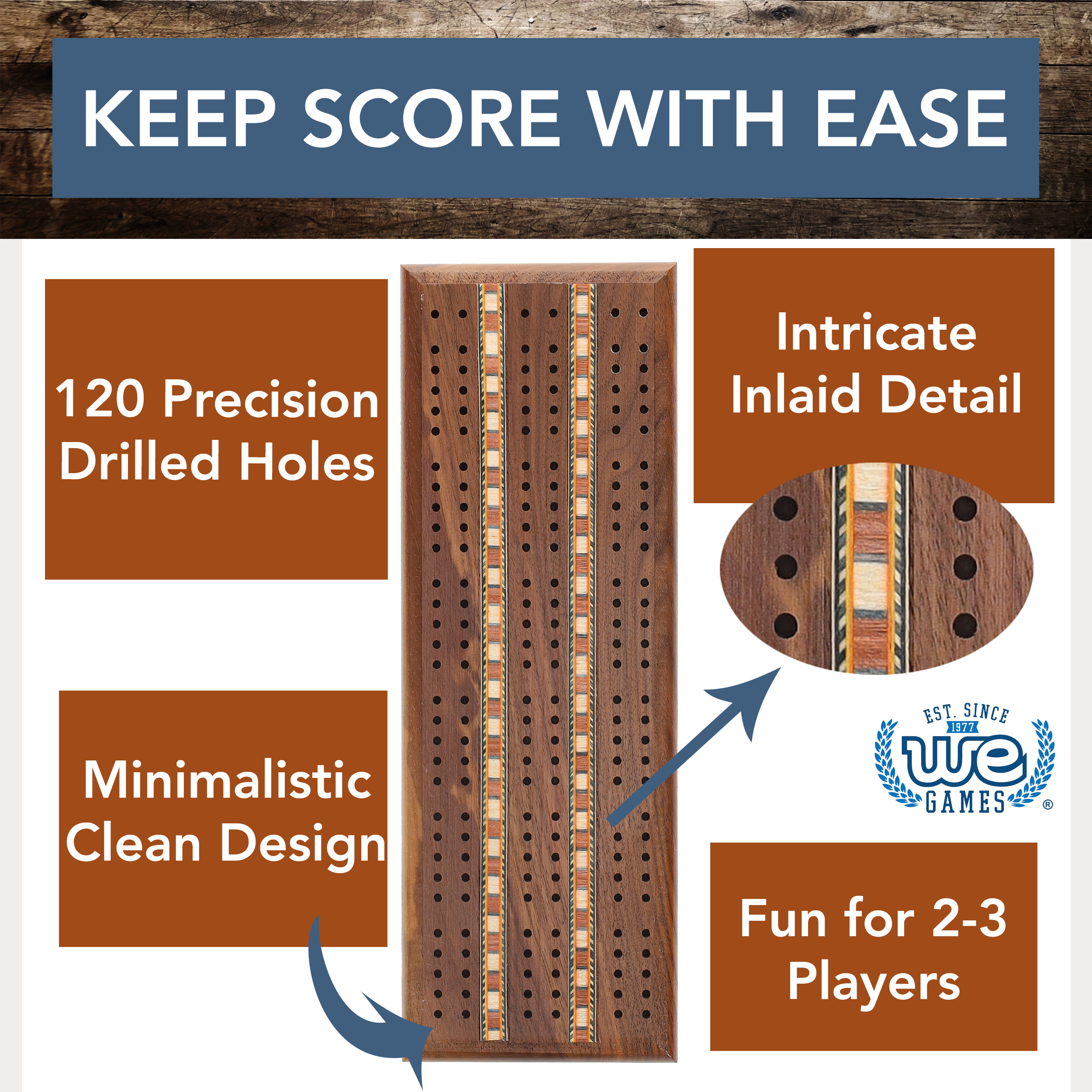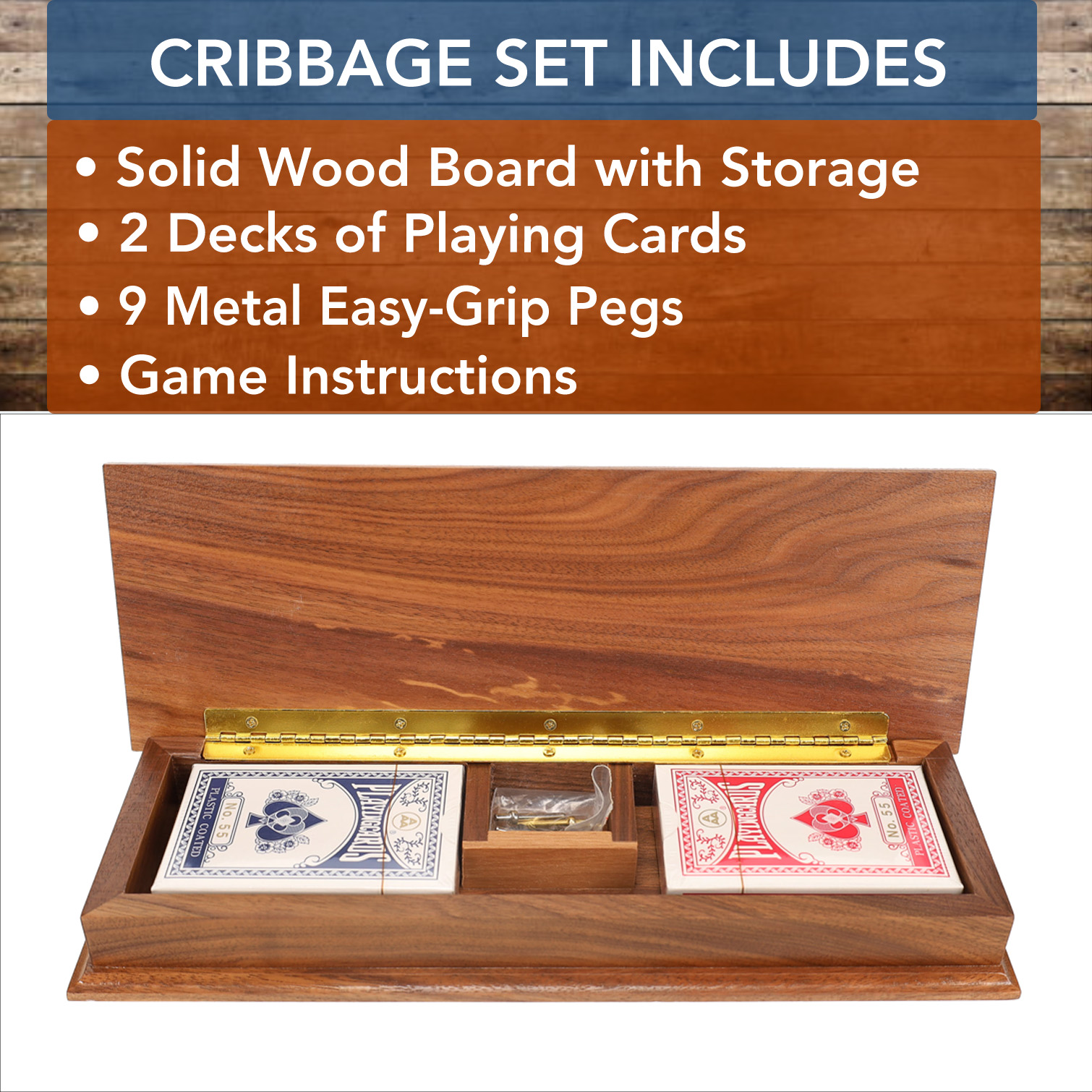This handsome three-track cribbage board is crafted from solid Walnut hardwood and features a beautiful wood inlay along the tracks. The sprint-style board features 60 precision drilled peg holes (30 up, 30 back). Open the cabinet door to reveal a storage area for the metal pegs and cards that are included. Makes an elegant gift that will be enjoyed for years to come and is one to pass down to the next generation.