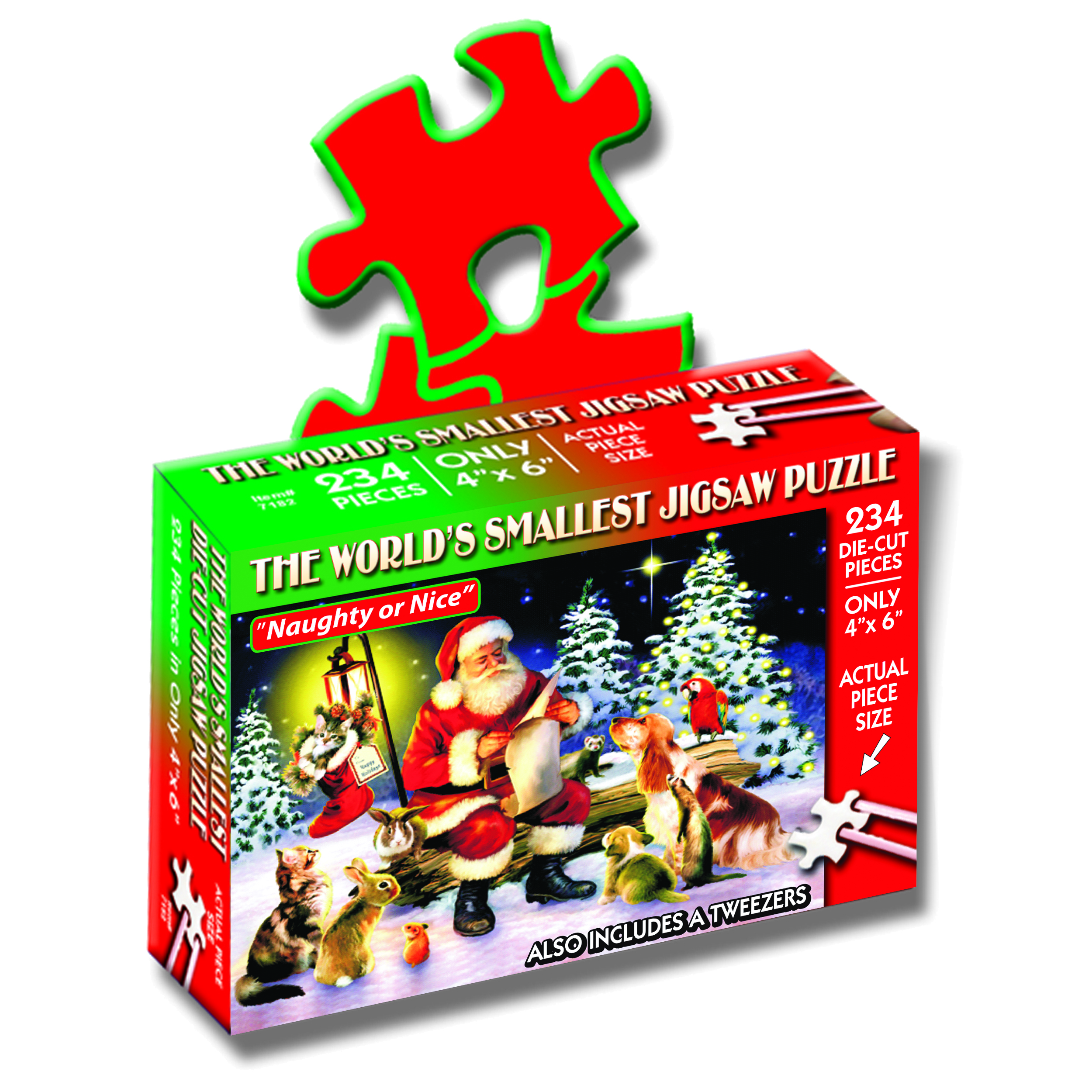 This is a mini puzzle with tiny pieces. While it is small, it can take an afternoon to assemble. This puzzle is great for those that enjoy puzzling, but don't want to sacrifice a whole table top for assembling a puzzle. This one doesn't take up much space, but will still provide you with hours of entertainment. It comes with a set of plastic tweezers that you will need to assemble the puzzle. Naughty or Nice depicts Santa Claus checking his list in a winter wonderland, surrounded by woodland creatures. Each piece is small enough to fit on the tip of your finger, making this the ultimate challenge to test your patience. Makes a great stocking stuffer.