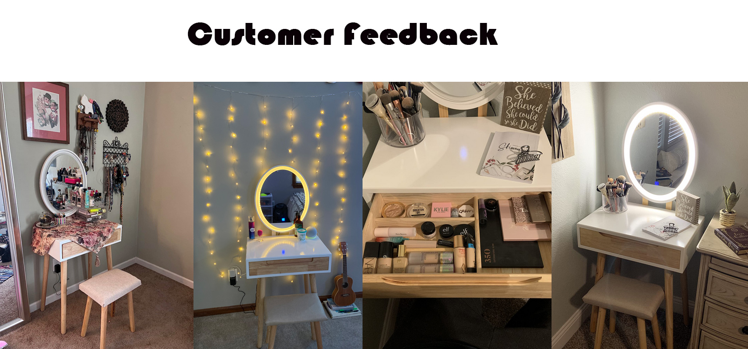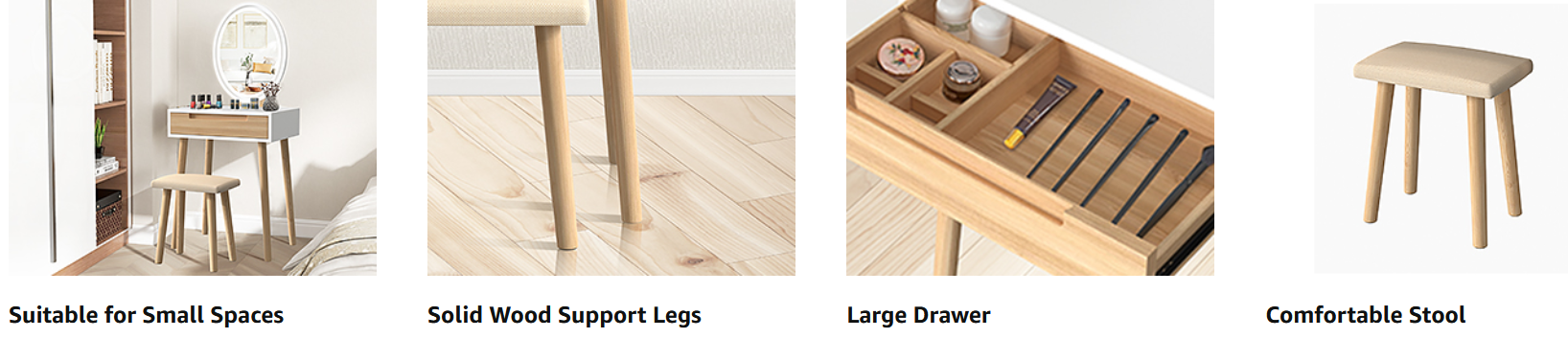 This makeup table provides enough space for you to store cosmetics, jewelries and other necessities. The wooden table and oak legs make this dressing table more durable and sturdy .