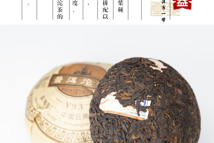 V93 ripe Pu Er tea was first released in 2005, a high classic, quality ripe Pu Er tea. Why it is called V93? Because it inherits the special recipe of high quality Menghai Pu Er tea produced in 1993; V is the code summary for the V93, V2, V4 series of Pu Er tea, whose recipes are the combination of past classic Maocha techniques, quality characters, taste and aroma with the new processing and invention.