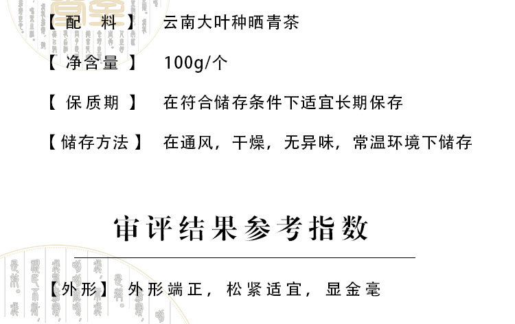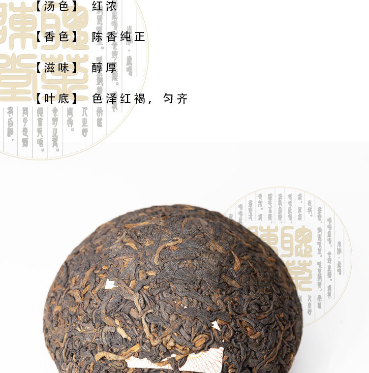 This tea's fermentation is appropriate, which is super for futher aging and storage. Its tea liquid is smooth and soft, with mellow and thick taste. Its sweet after taste is very long due to its careful selection on the Maocha. This is a ripe tea full of good Menghai taste. Good to long term storage and taste.
