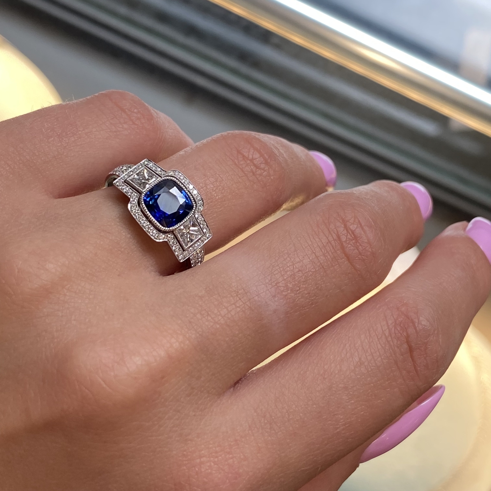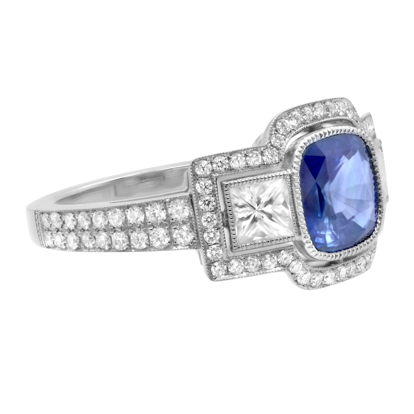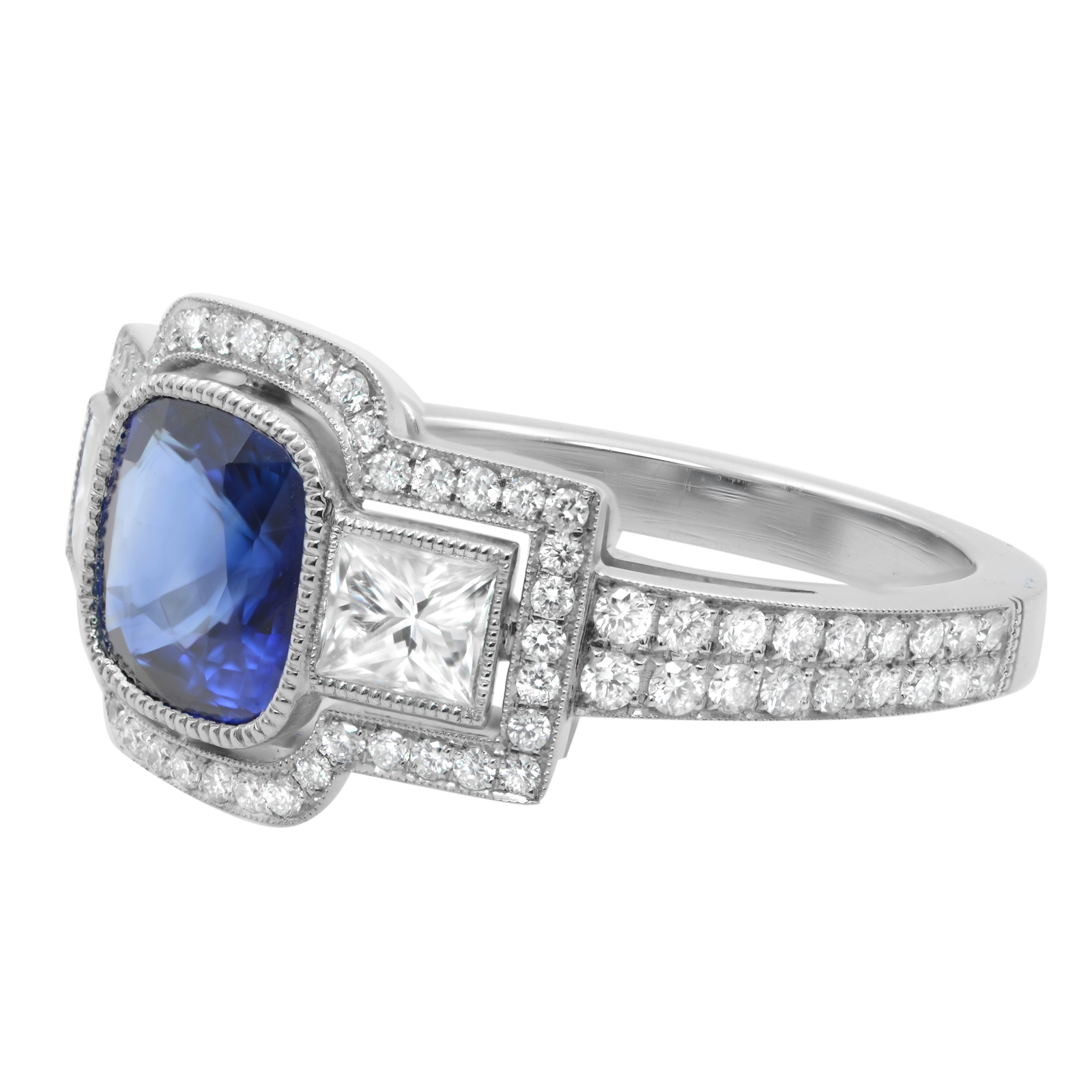 A darling and delicate, traditional style, newly made estate-style Blue Sapphire engagement ring crafted in platinum. The ring centers one bright pure Blue cushion cut Sapphire framed by the high polished bezel and flanked by a princess and round cut diamonds. Outlining this magnificent blue gem with twinning diamonds and polished borders creating a darling three-stone look. Center gemstone is 1.88cts. Side Diamonds: Princess Cuts 0.68cts. Round Cuts total 0.72cts. Ring size 6.5. Come with appraisal and a presentable gift box.
