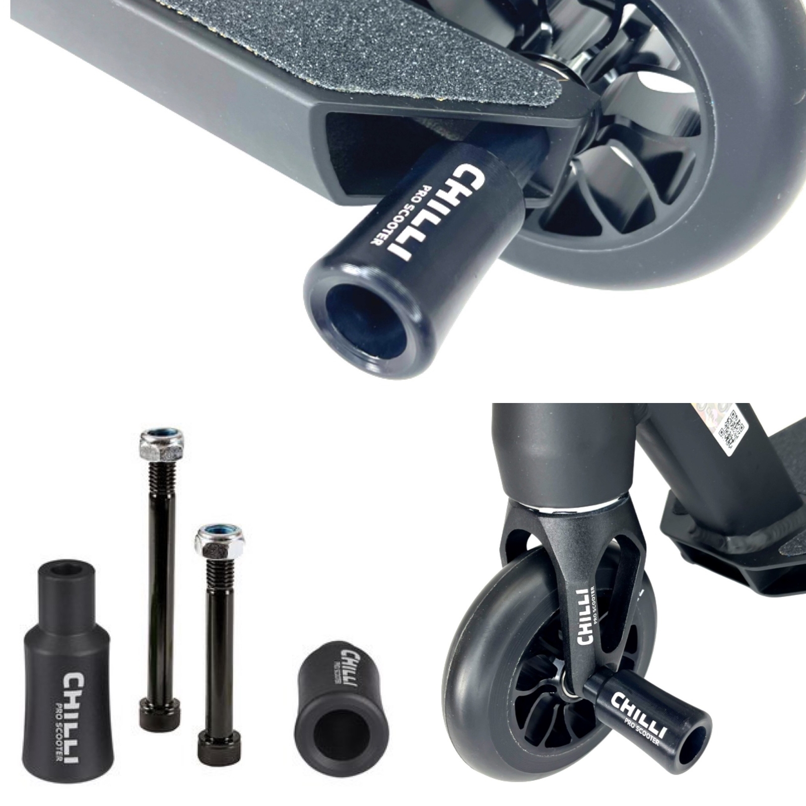 Die Chilli Stunt Scooter Pegs gibt es in verschiedenen Farben, Formen, Materialstärken und entsprechend in unterschiedlichen Gewichten.