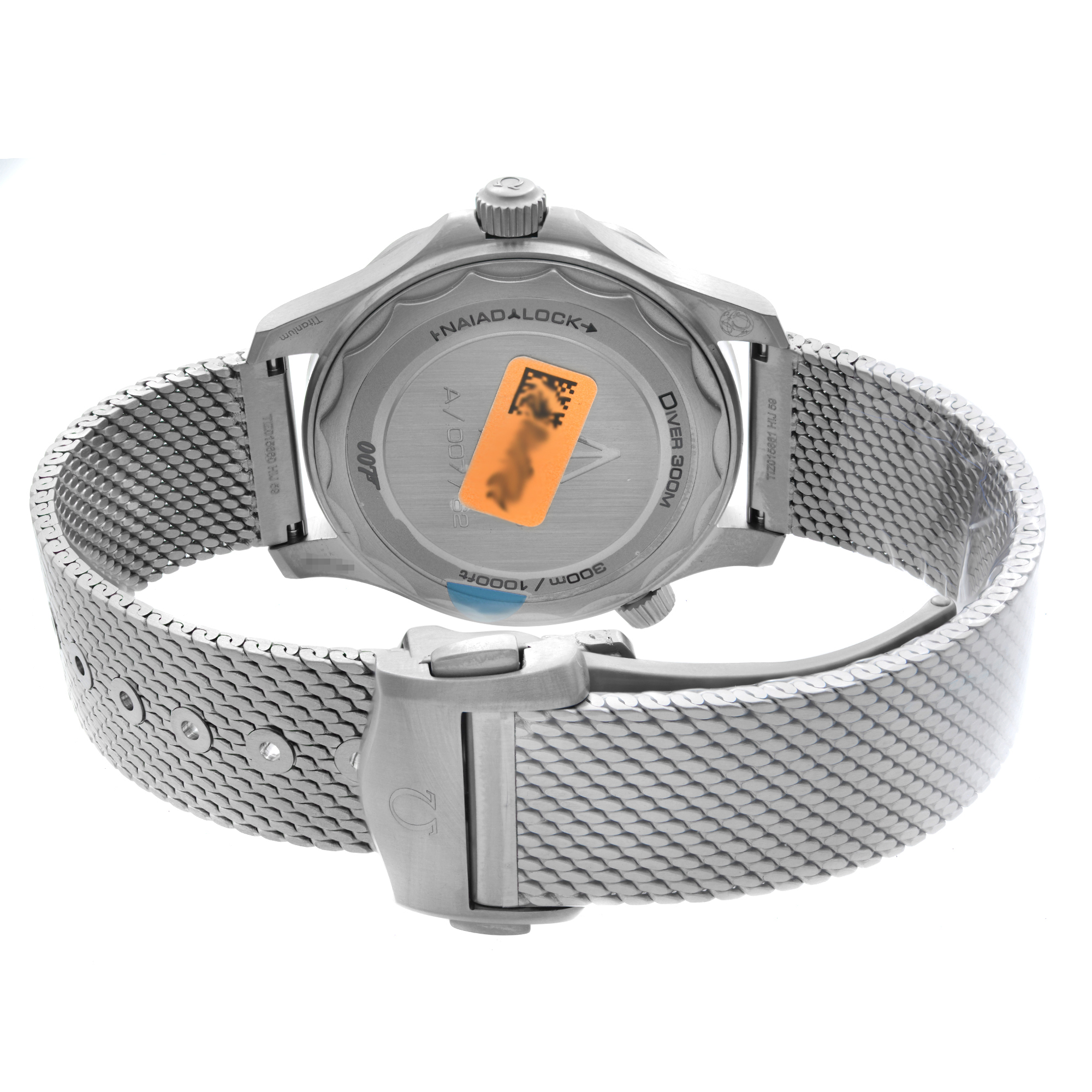 An image of a men's OMEGA wristwatch, luxury style, with a front full frontal view. The display model is in excellent condition, featuring a round titanium case and a titanium band with a textured design. It has a black dial and black bezel, with non-numeric hour marks and 12-hour dial indices, complemented by luminous hands. The Omega logo and "Seamaster" text are visible on the dial, along with the words "CO-AXIAL MASTER CHRONOMETER 300m / 1000ft" indicating its water resistance. The image is a close-up, capturing the watch face and a portion of the band, providing a clear view of the watch's features. An image of a front close-up shot of an OMEGA men's wristwatch display model. The luxury-styled watch features a round titanium case and a black dial with non-numeric hour marks and luminous hands. The black bezel is marked with a minute scale, and the watch has a titanium band. The watch face reads "OMEGA Seamaster Professional, CO-AXIAL MASTER CHRONOMETER, 300m / 1000ft" indicating its high-quality craftsmanship and water resistance. The image is taken at a direct angle to the watch, showing the face in excellent condition and clear detail. An image of a luxury OMEGA men's wristwatch, captured from a side profile view with the crown visible on the right side. The watch is a display model, featuring a black dial and bezel, round titanium case, and titanium band with a metallic mesh design. Luminous hands are seen on the watch face, and the image is taken at a close distance, focusing on the details of the watch's side and dial. An image of a luxury men's OMEGA wristwatch in display model condition, shown from a side profile view opposite the crown. The round titanium case and the titanium band are visible, with a black dial and black bezel. The watch features luminous hands and is taken from a close angle, highlighting the brand name and watch details. An image of a men's OMEGA wristwatch, displaying the back view with the clasp closed. The watch is a display model with a titanium case and band, showcasing a solid caseback and a round shape. The titanium band features a fold-over clasp with double push buttons. The watch is positioned upright at a perpendicular angle to the camera, providing a clear view of the caseback and band details. The image is taken from a close distance, ensuring all intricate details are visible. An image of a men's OMEGA wristwatch, display model, featuring a titanium case and band with a round watch shape. The back view showcases a solid caseback with branding details, and the clasp is open, revealing a fold-over closure with double push buttons. The wristwatch is positioned at a slight angle with the top of the watch facing slightly to the right and the open clasp extending to the left, all against a neutral background and photographed from a medium distance. An image of a men's OMEGA wristwatch, displayed as a model with its box and documents in full view. The watch is positioned diagonally across the frame with the top left corner closer to the viewer, showcasing a brown leather strap on the left and a silver metal mesh bracelet on the right. The watch face is visible with a black dial and luminous markers. Below the watch, red warranty and pictogram cards are partially visible, with the OMEGA logo on a black box in the background to the right. The shot is taken from a close, overhead angle, capturing the details of the watch and accompanying materials.