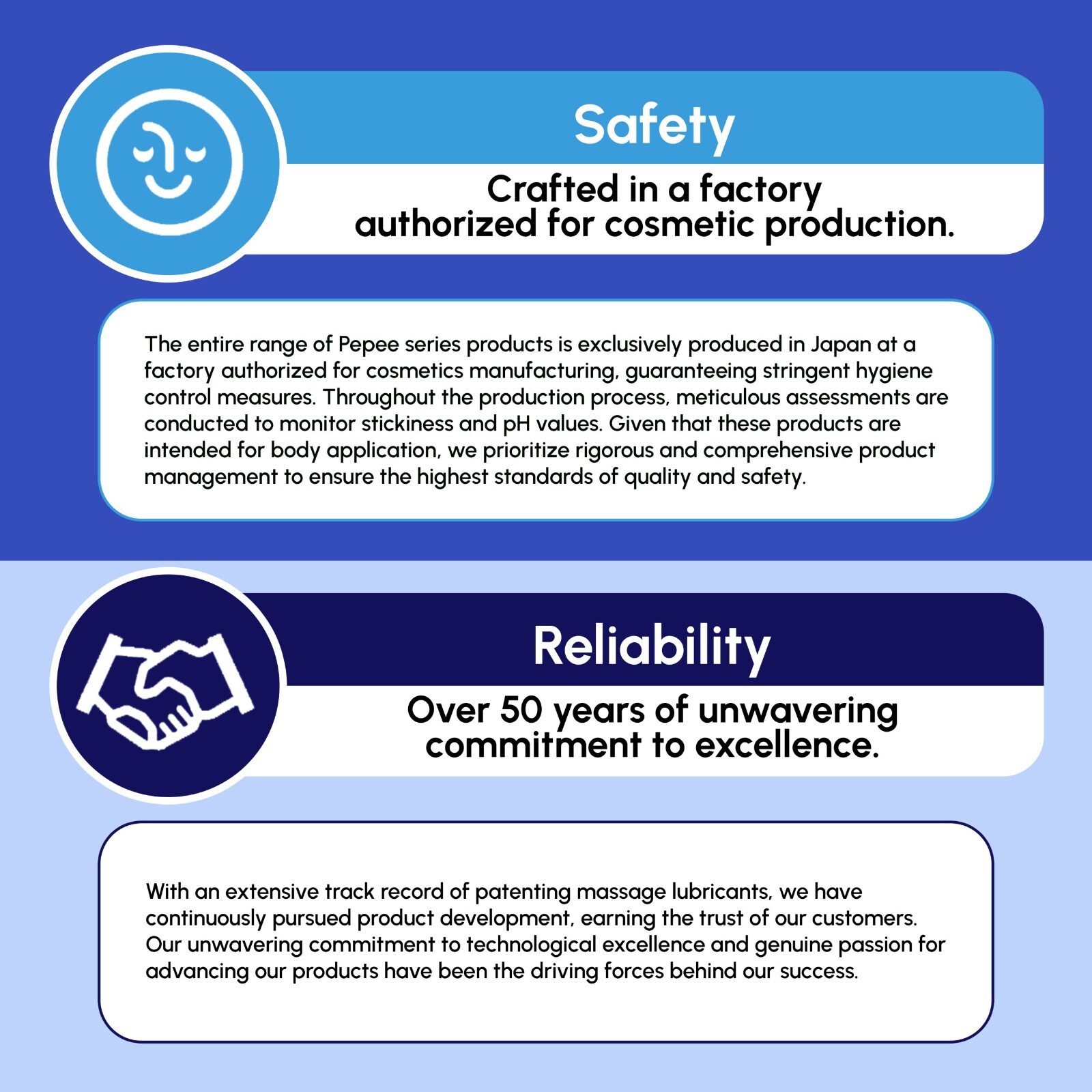 The entire range of Pepee series products is exclusively produced in Japan at a factory authorized for cosmetics manufacturing, guaranteeing stringent hygiene control measures. Throughout the production process, meticulous assessments are conducted to monitor stickiness and pH values. Given that these products are intended for body application, we prioritize rigorous and comprehensive product management to ensure the highest standards of quality and safety.