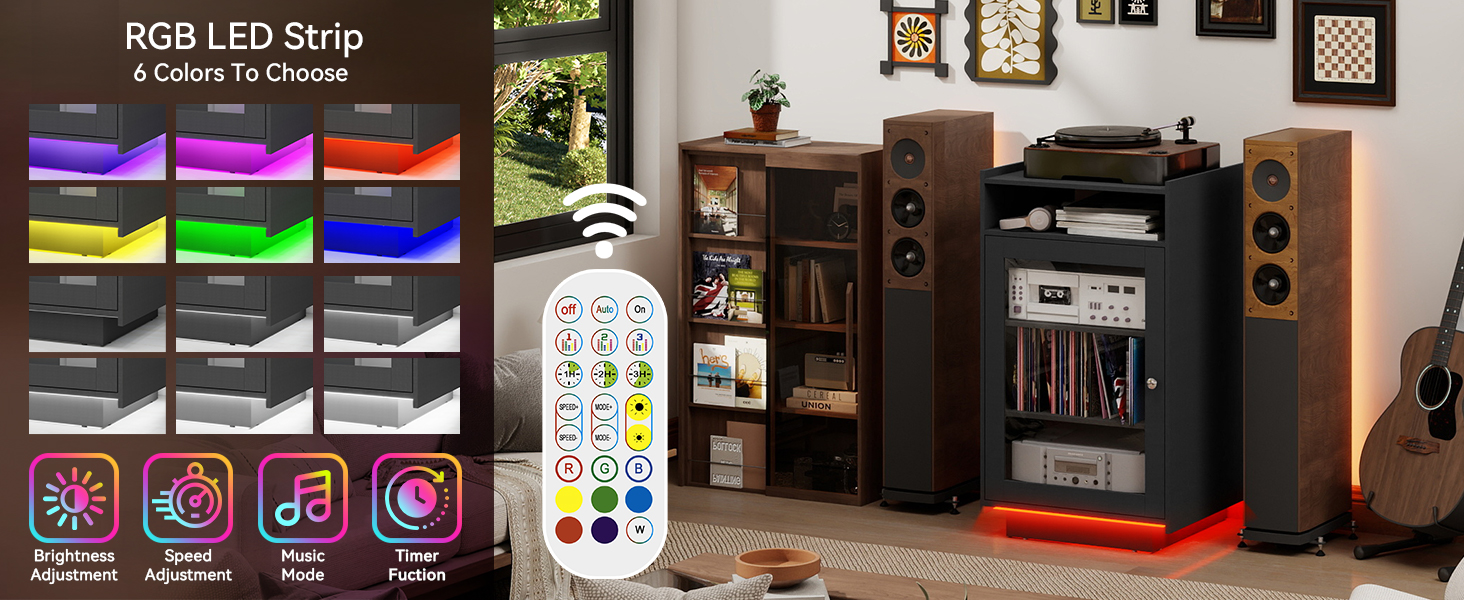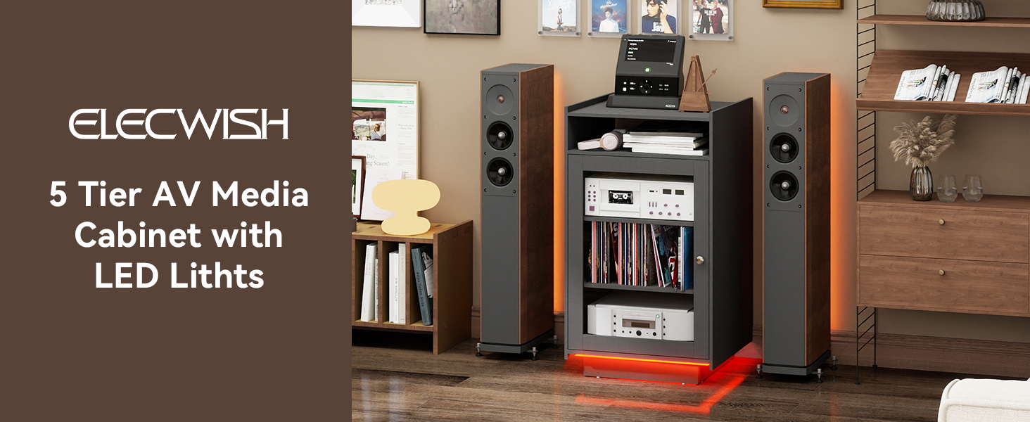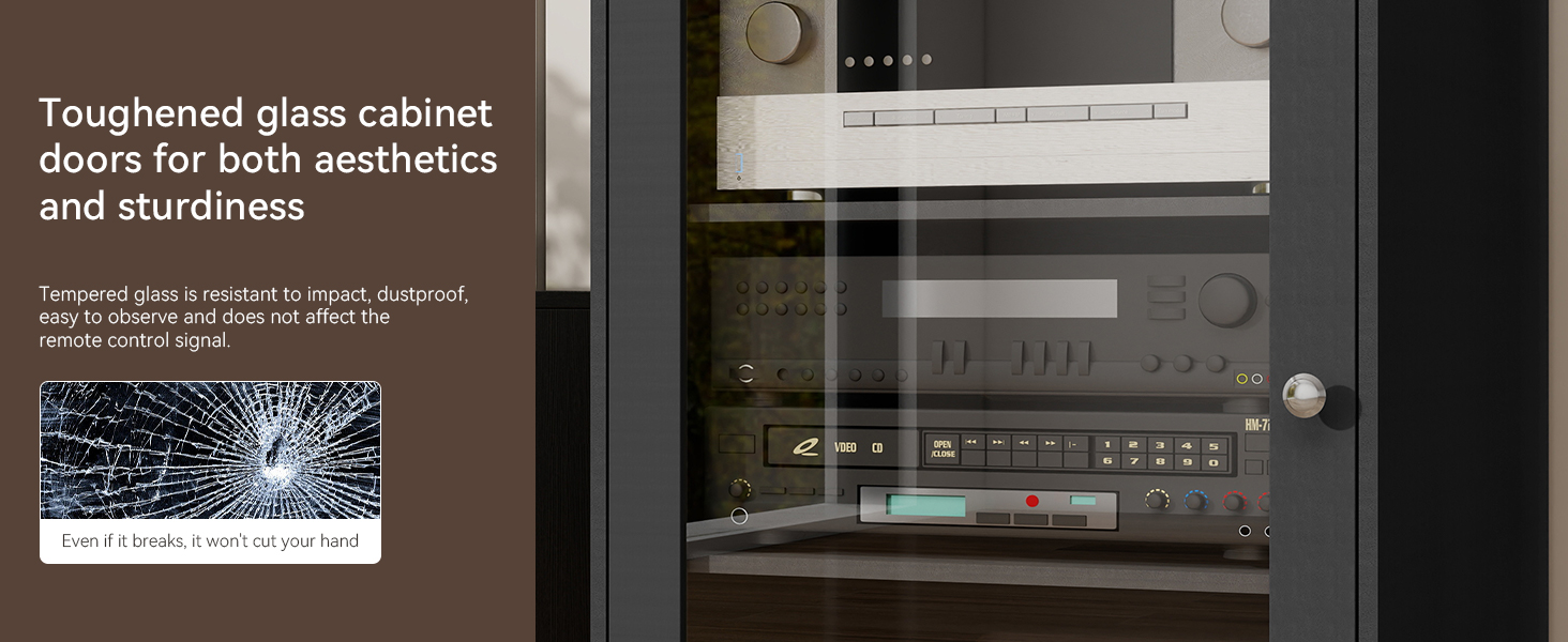【5-Tier Large Capacity】This media stand offers 5 adjustable shelves, creating abundant open storage for your AV gear. Securely organize amplifiers, turntables, receivers, and game consoles behind a dust-resistant tempered glass door.