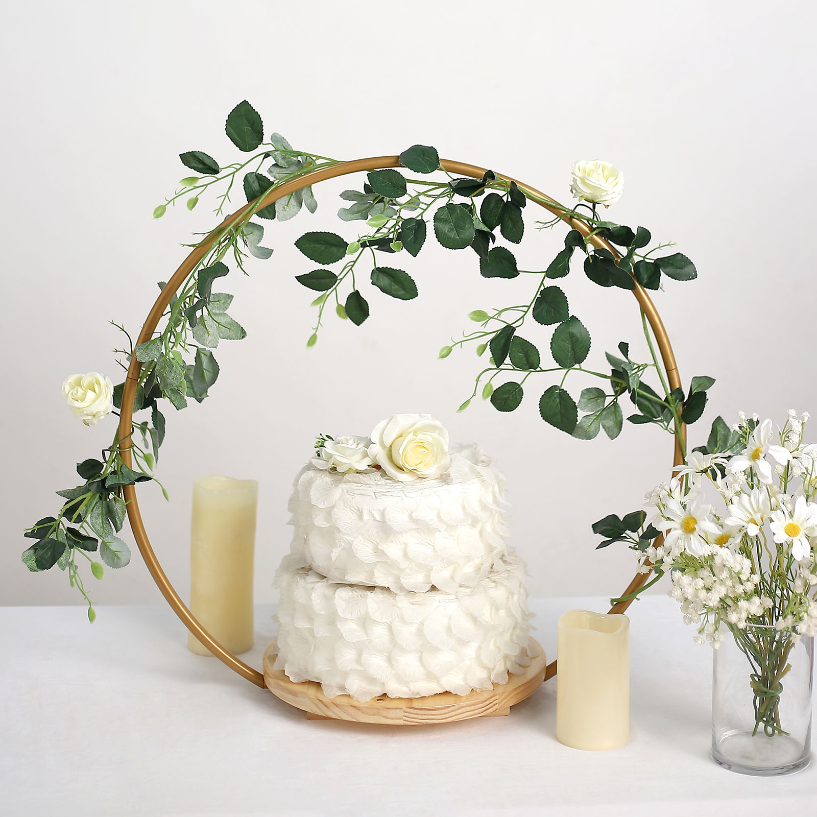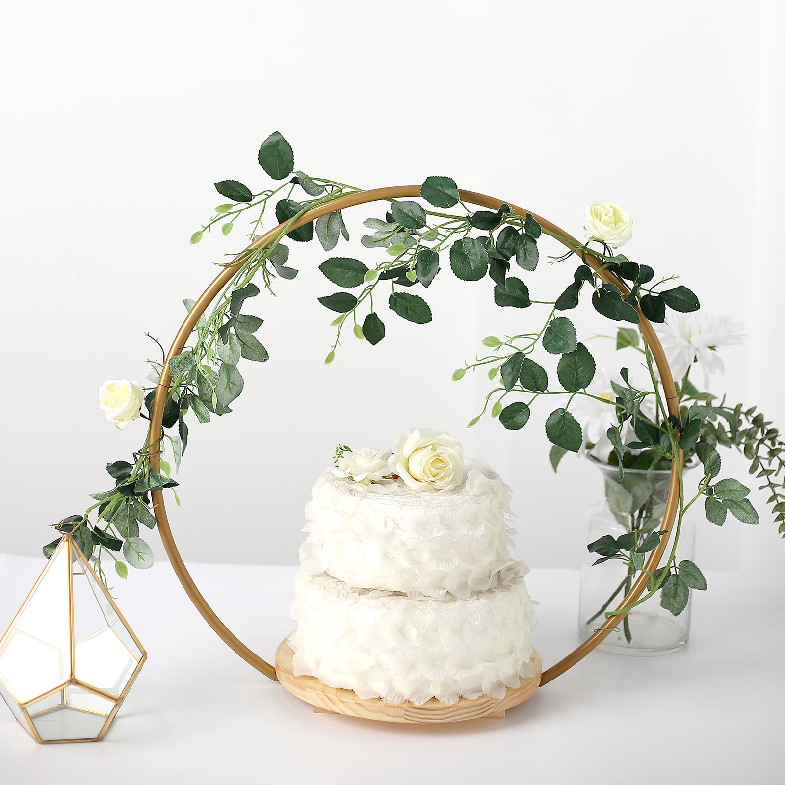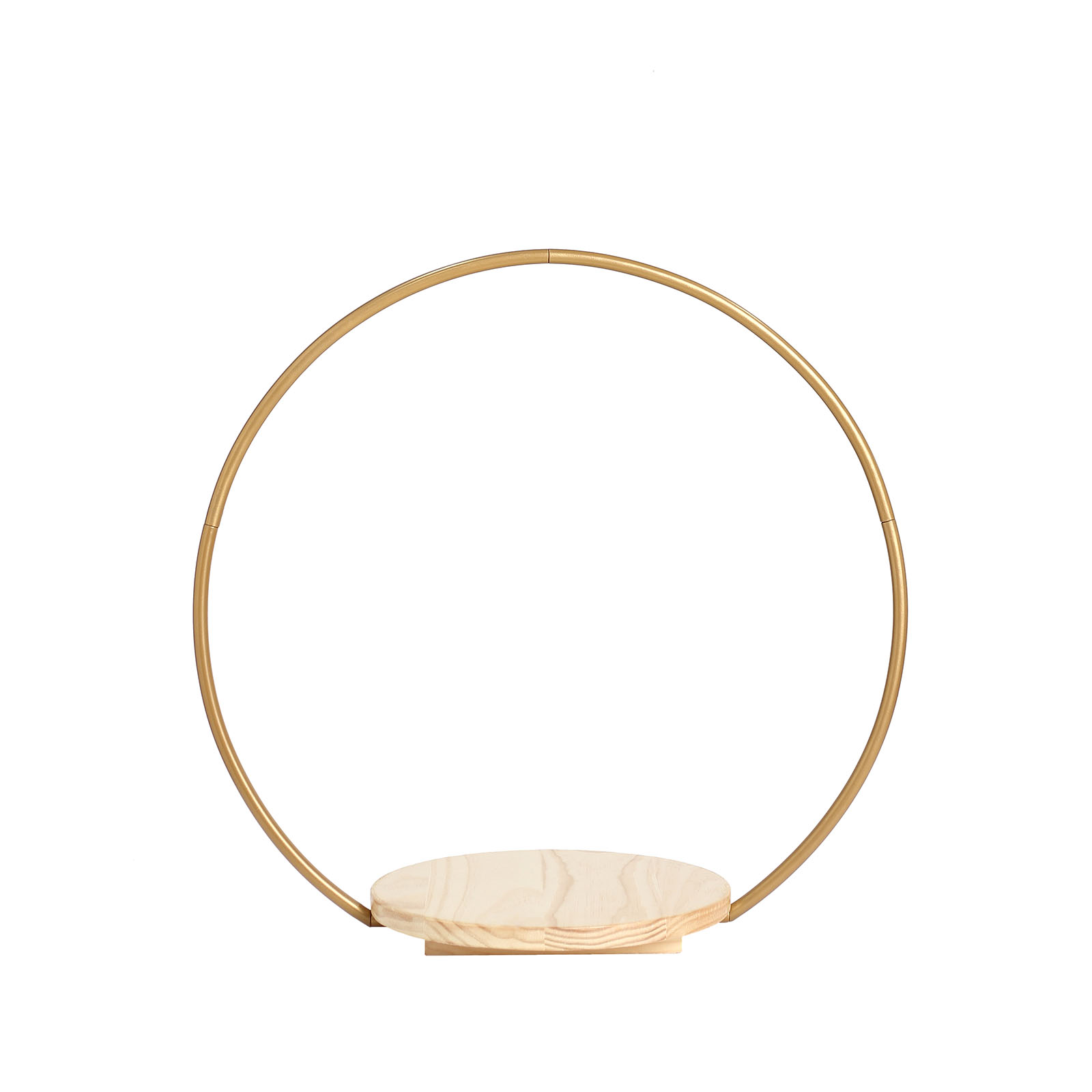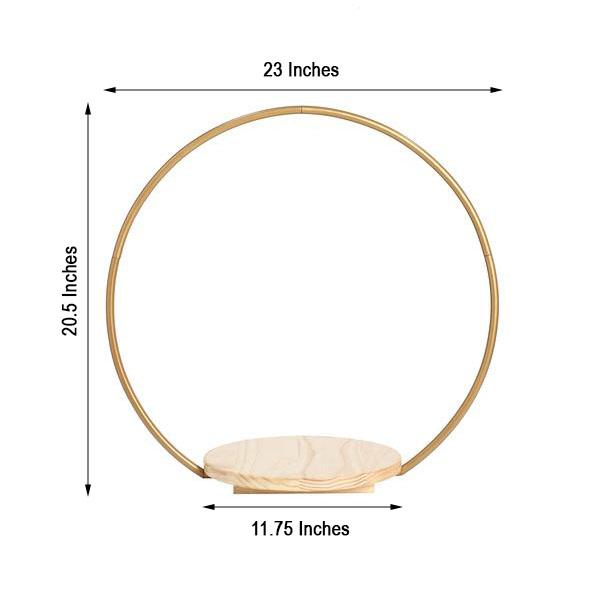 This decorative cake display stand will create an eye-catching look for your party tables. Featuring a geometric metal hoop with natural wood base, this stylish and functional display stand can be used in several ways. Use it to present your cupcakes, desserts and sweet treats in style. Make it a base for your flowers, greenery, candles or any centerpieces. The metal arch can be accented with LED lights or garlands to add charm to your dessert station. The possibilities are endless! This cake stand will also make a perfect gift for family and friends.