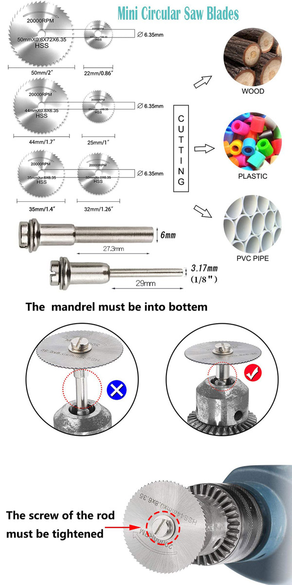 - Set of 6 different size mini circular saw discs blades for use in hobby mini drills for