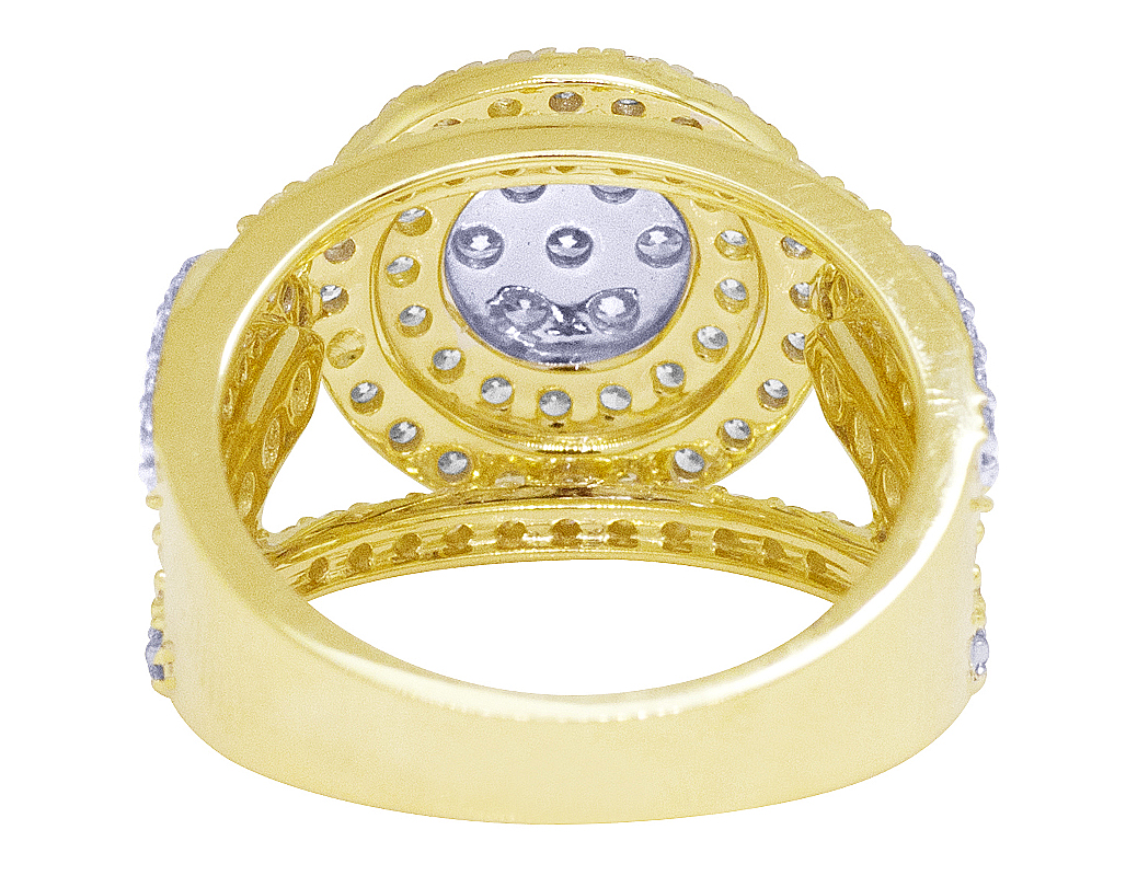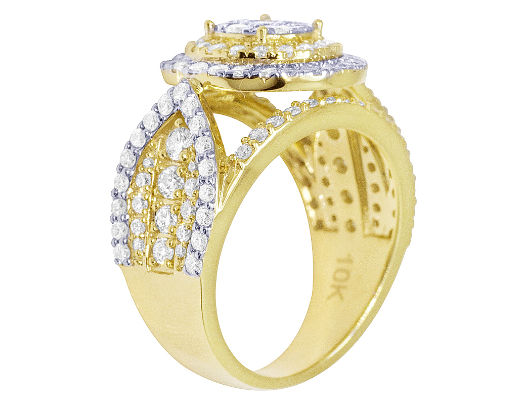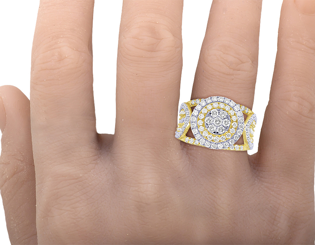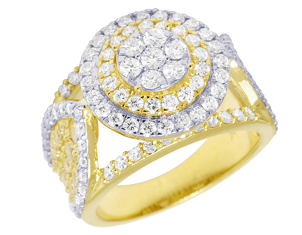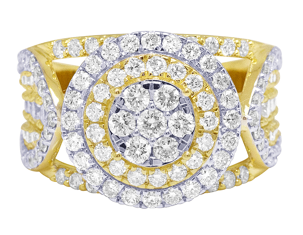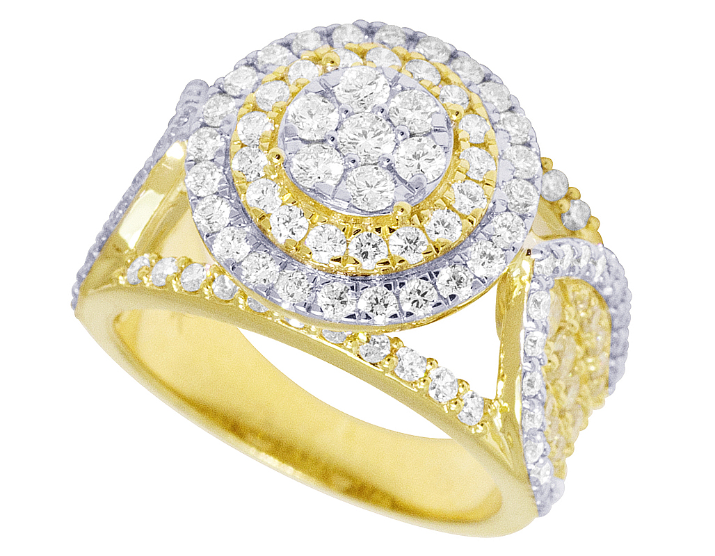 Enchant the one you love with this outstanding ring casted in 10K Yellow/ White Gold, this gorgeous ring features cluster of diamonds wrapped in two-tier round shaped diamond frames with rows of diamonds on the ring's shank in an intricate design enhancing the look of this beautiful ring. Each stone is VS2-SI1 clarity with G-H color weighing 7.8 grams. With a bright finish and glimmering diamonds, the ring speaks for its timelessness.