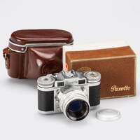 Sucherkamera für 24x36mm in hervorragendem Zustand, selten mit lichtstarkem Luxon 2/50mm Nr.93074, Deckel, Etui, mit originaler brauner Samtbox des Herstellers.