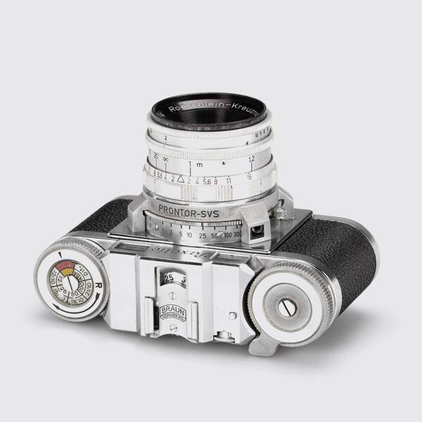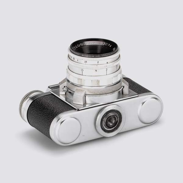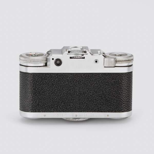 RF camera for 24x36mm in excellent condition, uncommon with fast Luxon 2/50mm no.93074, cap, case, original maker's brown velvet box. Sucherkamera für 24x36mm in hervorragendem Zustand, selten mit lichtstarkem Luxon 2/50mm Nr.93074, Deckel, Etui, mit originaler brauner Samtbox des Herstellers. Condition: B/A Year: c.1953 SN: