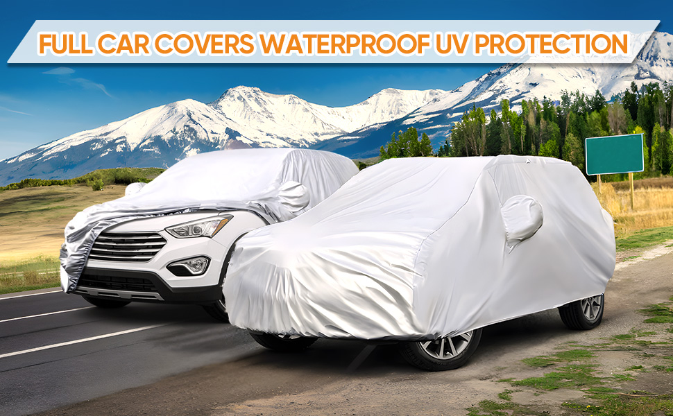 【Premium Material Fit Compact SUV】---Made of polyester taffeta lightweight waterproof material, easy to install. full exterior covers coated with silver to resist UV, high density, and durability. The car covers for automobiles Keep your vehicle safe & clean summer to winter.