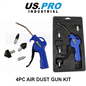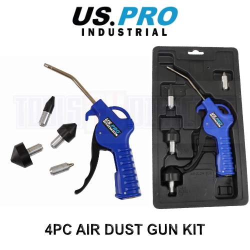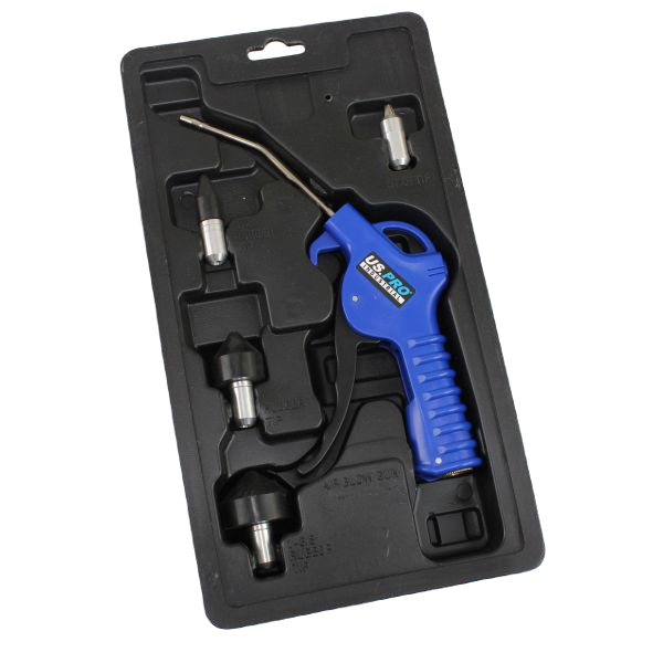 Air dust gun with interchangeable nozzles. Comes with a 4" (100mm) nozzle and a selection of attachments for different cleaning applications.