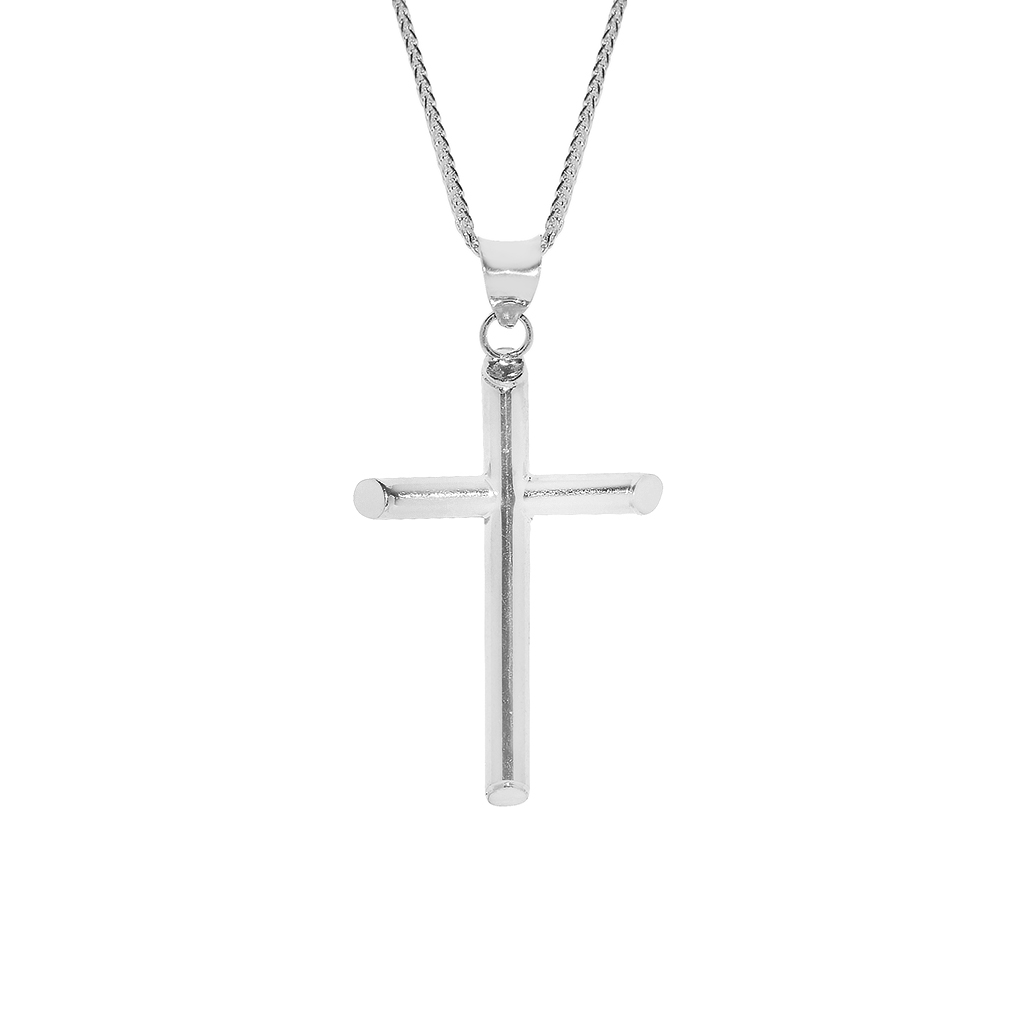 This traditional-style cross pendant is expertly crafted from 14k white gold, featuring a rounded three-dimensional design that exudes elegance. The pendant has a high-polish finish and measures approximately 1.37 inches in length. Complementing the pendant is a 14k white gold chain, designed in a square wheat style with a width of 0.8 mm. The chain is available in various lengths, allowing you to choose between 16, 18, 20, or 22 inches. The pendant dimensions include a width of 15 mm and a length of 35 mm, making it a striking piece of religious jewelry suitable for both men and women. The necklace is secured with a reliable lobster claw clasp. This 14k gold faith jewelry blends timeless design with contemporary style, making it a meaningful accessory for any occasion. All measurements are approximate and may vary slightly per item, ensuring each piece retains its unique charm.