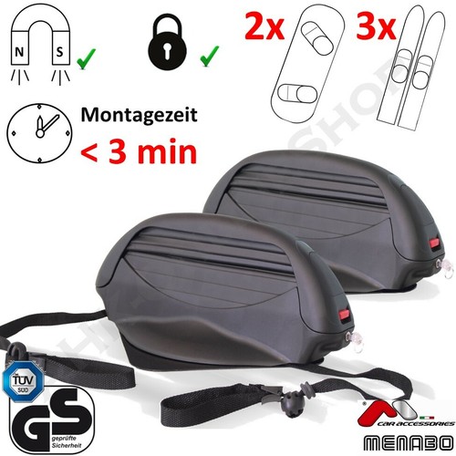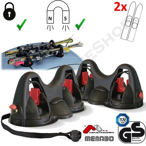 Magnetischer Menabo-Magnet-Skiträger mit aerodynamischem Design, der für einfaches Laden von Skiern und Stöcken sorgt und ihn sicher sichert. Leicht, praktisch und einfach zu installieren.