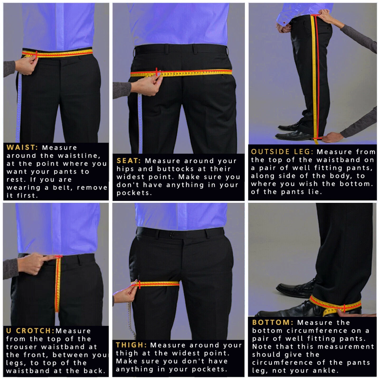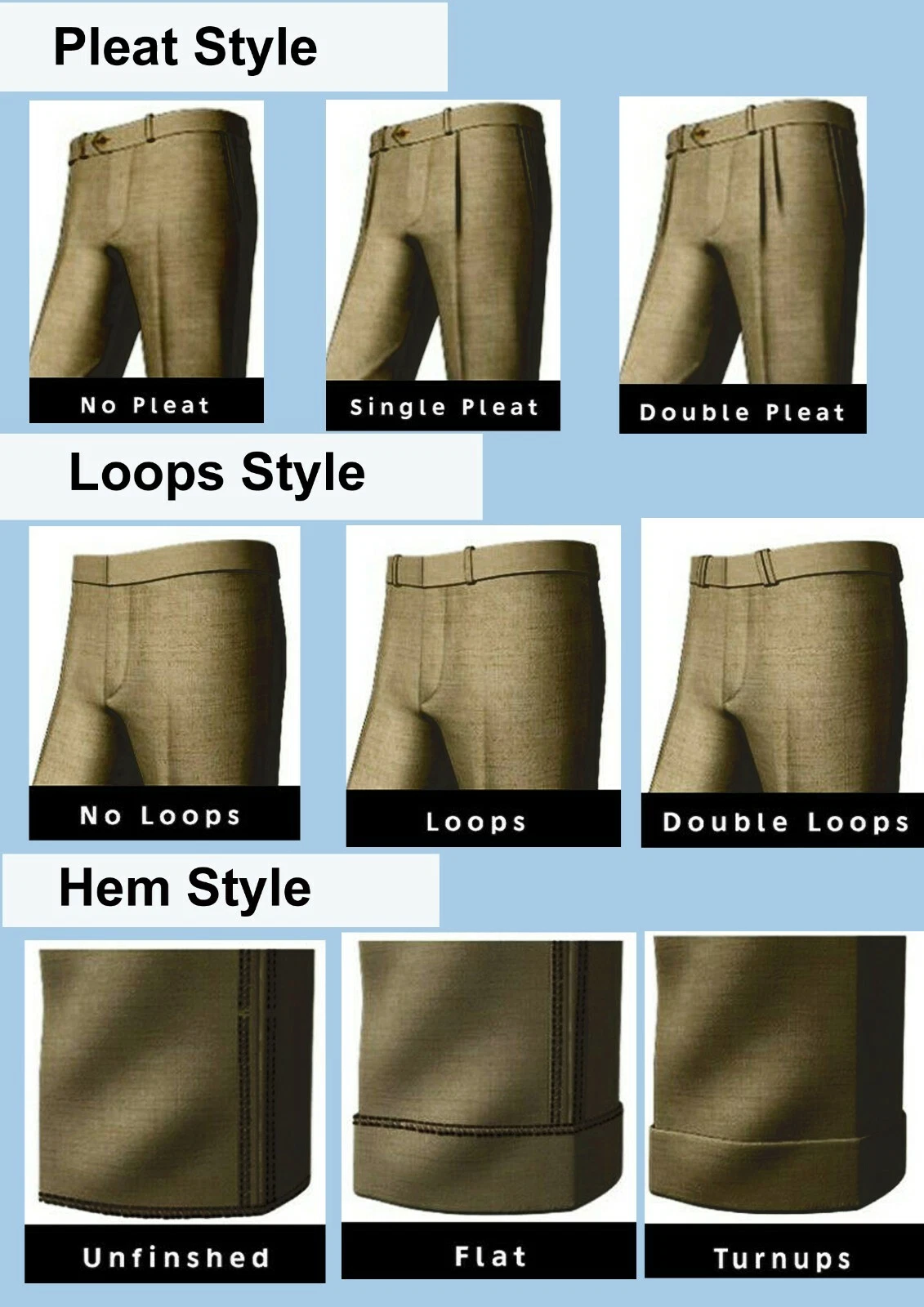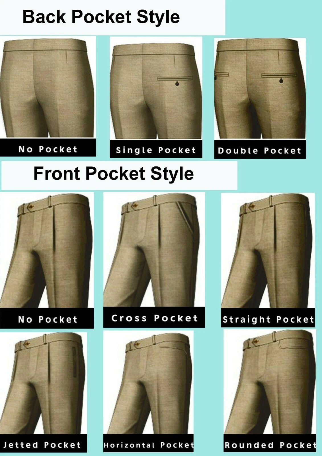1. Buy it Now this listing 2. Send us your specification (your ready made cloth size) or (your body measurement) and what style Pants you want using ebay messages. Simply copy and paste the following text in to the message box 1. Fabric Code : 2. Your Ready made cloth size or put below measurement its should be your exact body measurement. 1. Trousers Length…………………? 2. Waist…………………………………..? 3. Hips……………………………………..? 4. Crotch…………………………………? 5. Thigh……………………………………? 6. Knee……………………………………… 7. Bottom……………………………………? Trousers Style 1. Trousers front style ………………………… ? Pleat or plain front 2. Back pocket ………………………… ? Single pocket or double pocket 3. Hem/cuffs ------------------------? Flat or Turnups Or unfinished |