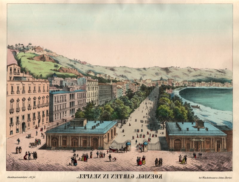 Die grosse Welt in kleinen Bildern. Berliner Bilderbogen aus zwei Jahrhunderten, p. 113 (Nr. 70). Selten wie alle Guckkastenblätter von Winckelmann & Söhne, zeigt die ehemalige Villa Reale, heute die Villa Communale in Neapel von der Piazza Vittoria mit Blick Richtung Osten. Farbfrisch und dekorativ. Ein weiteres Exemplar etwas knapprandig, leicht fleckig, mit Mittelfalz ( 280,00 € ).