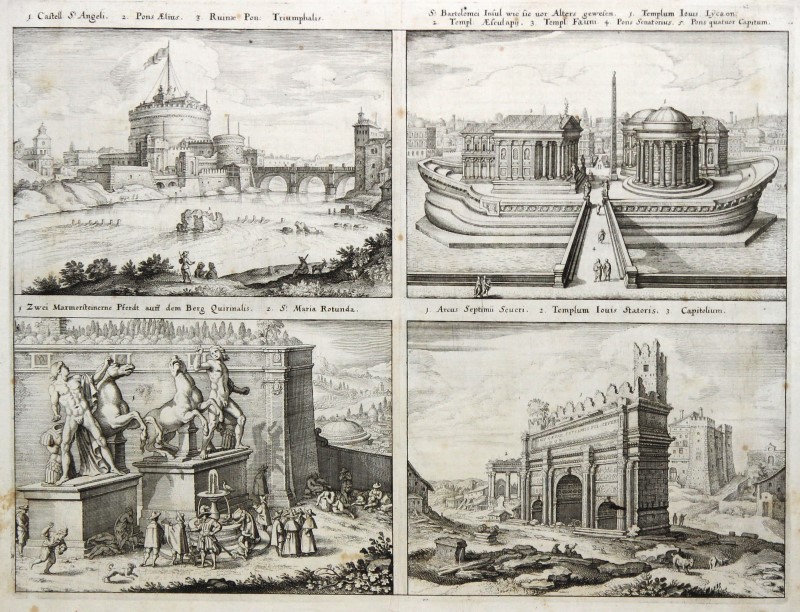 Le viste parziali mostrano Engelsburg, Isola Tiberina, cavalli sulla montagna di Quirinale, arco trionfale del Septimus Sevelus. (12,3 x 16,8 ciascuno).