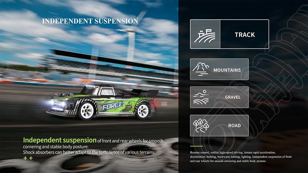 1. Full simulation structure design, full real car control feeling (remote control, realizing high-speed driving, instant acceleration, deceleration, braking, backing, turning, lights. Independent suspension of front and rear wheels for smooth cornering and stable body posture.