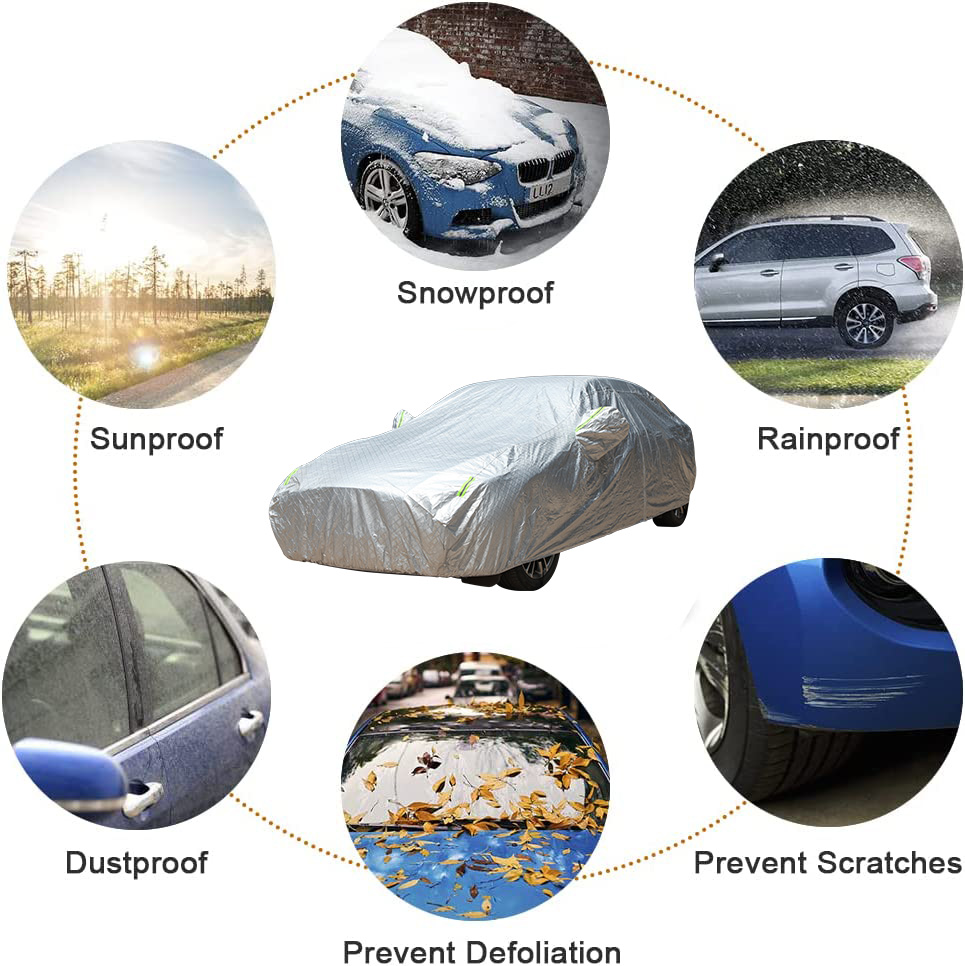 【High Quality Material】The car cover is made of Aluminum film material by pressing into a light but strong car cover. More durable than most car covers on the market. 【 Top Quality with Door Zipper】Our cover plus an added door zipper conveniently placed for you to get things in and out of your car without taking your entire full exterior car cover off .