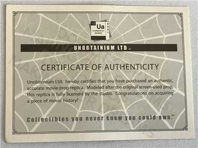 COA reads: "Unobtainium Ltd hereby certifies that you have purchased an authentic, accurate movie prop replica."